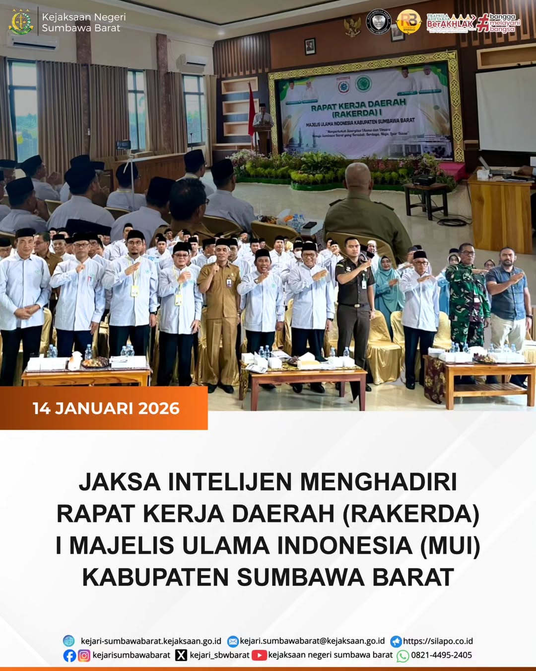 Pada hari Rabu, 14 Januari 2026. Kepala Kejaksaan Negeri Sumbawa Barat dalam hal ini diwakili oleh Jaksa Fungsional Veriant Rifqi Refliana, S.H, mengikuti Rapat Kerja Daerah (Rakerda) I Majelis Ulama Indonesia (MUI) Kabupaten Sumbawa Barat Tahun 2026 yang diselenggarakan di Lt. 3 Gedung Graha Praja Sekretariat Daerah Kab. Sumbawa Barat. Kegiatan ini bertujuan untuk membahas rencana kerja tahun 2026 yang berkaitan dengan keadaan Ummat khususnya di Kab. Sumbawa Barat yang dimana dengan rencana kerja tersebut dapat dirasakan manfaatnya oleh seluruh umat beragama.