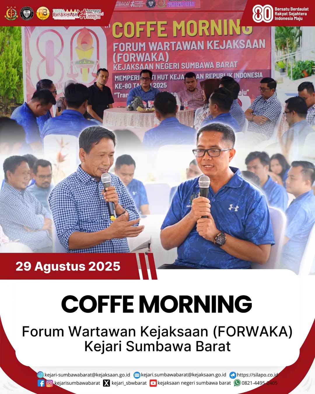 Pada hari Jum’at, 29 Agustus 2025. Kepala Kejaksaan Negeri Sumbawa Barat Bapak Agung Pamungkas, SH., MH, didampingi oleh para Kasi dan Kasubbagbin beserta kasubsi mengadakan kegiatan rutin Coffe Morning bersama para Insan Pers yang tergabung dalam Forum Wartawan Kejaksaan (FORWAKA) yang dilaksanakan di Halaman Kantor Kejari Sumbawa Barat.