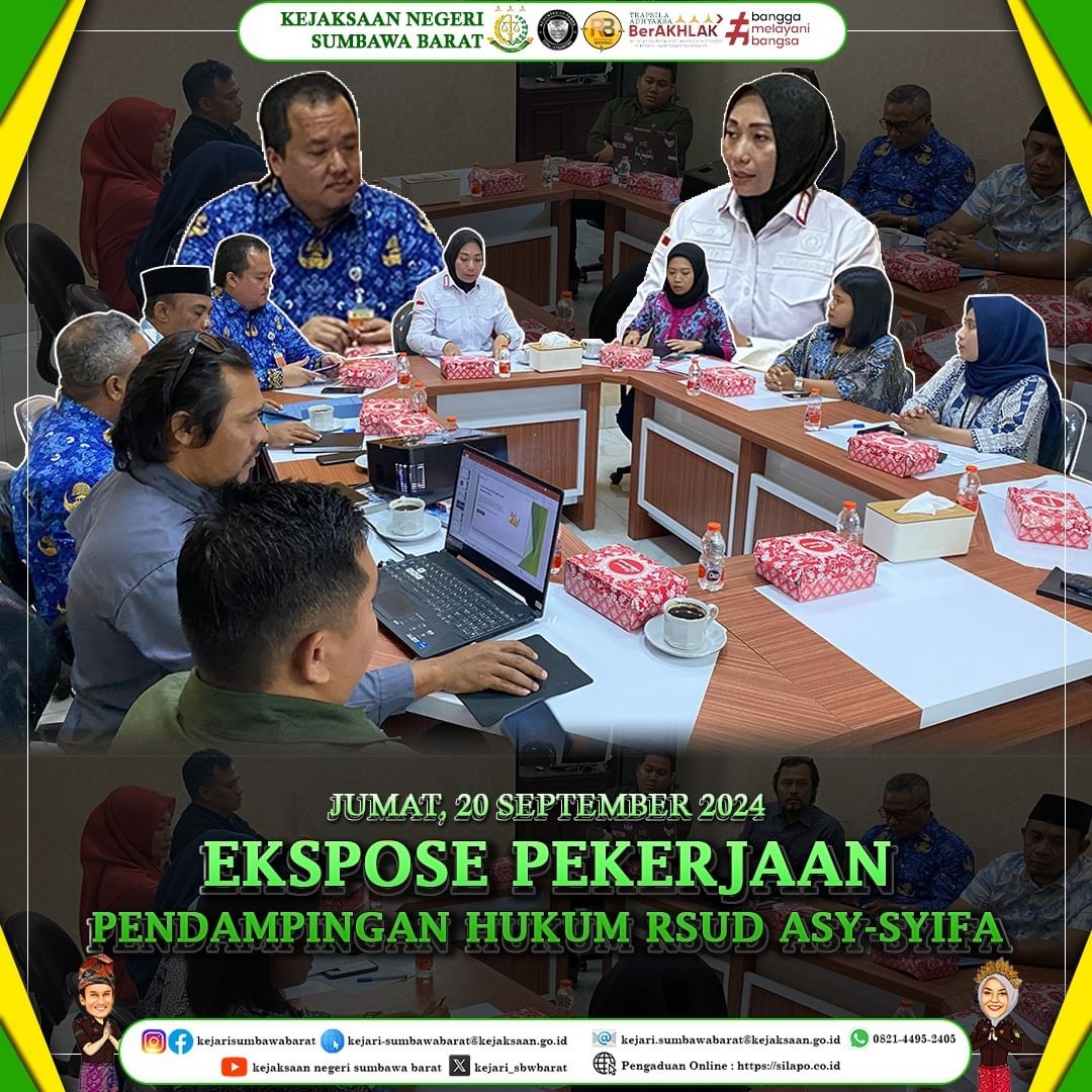Pada hari jumat tanggal 20 September 2024 bertempat di Kantor Kejaksaan Negeri Sumbawa Barat telah dilaksanakan ekspose awal pelaksanaan pekerjaan RSUD Asy-Syifa’ Kabupaten Sumbawa Barat yang dimintai pendampingan hukum.