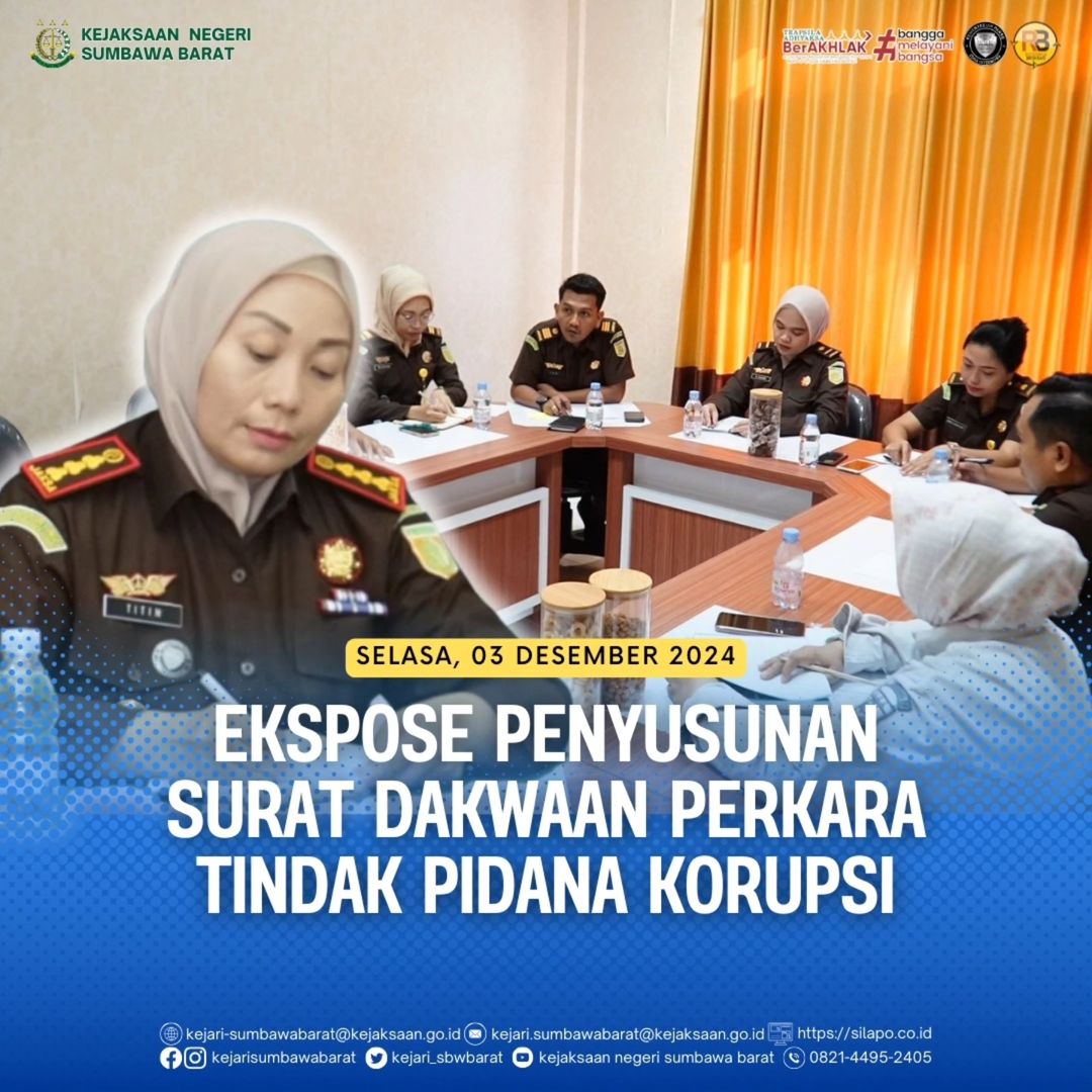 Pada hari Selasa, 03 Desember 2024.Bertempat di Ruang Rapat Kejaksaan Negeri Sumbawa Barat, Kepala Kejaksaan Negeri Sumbawa Barat, Dr. Titin Herawati Utara, SH.,MH memimpin ekspose dakwaan dugaan tindak pidana pencucian uang dengan tindak pidana asal dugaan tindak pidana korupsi pengelolaan keuangan pada perusahaan daerah Kabupaten Sumbawa Barat tahun anggaran 2016 sampai dengan tahun 2021 atas nama tersangka inisial “EK”.