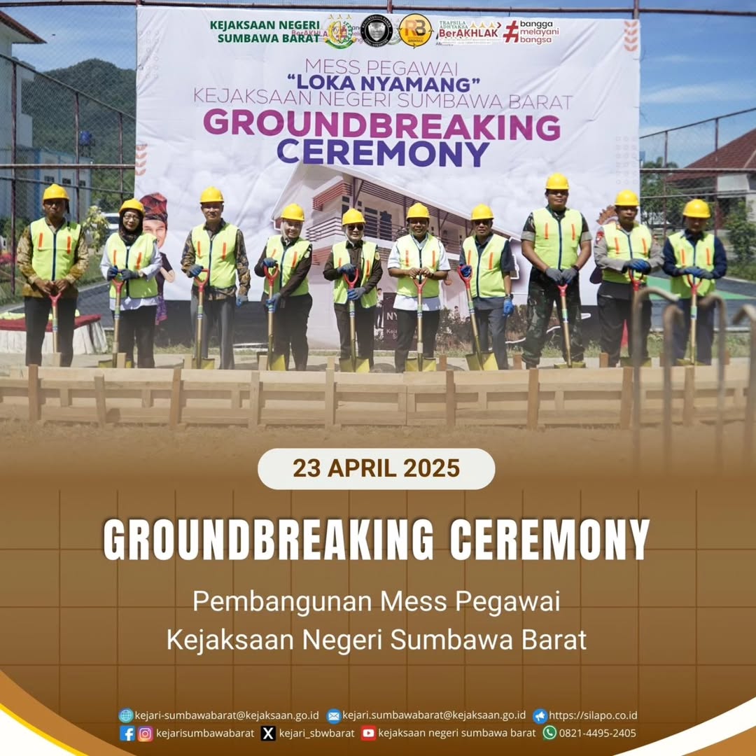 Pada hari Rabu, 23 April 2025. Peletakan Batu Pertama (Groundbreaking) pembangunan Mess Pegawai Kejaksaan Negeri Sumbawa Barat yang dipimpin oleh Kepala Kejaksaan Tinggi NTB, Ibu Enen Saribanon, SH.,MH didampingi Kepala Kejaksaan Negeri Sumbawa Barat dan Forkopimda Kab. Sumbawa Barat bertempat dilingkungan Kantor Kejaksaan Negeri Sumbawa Barat.