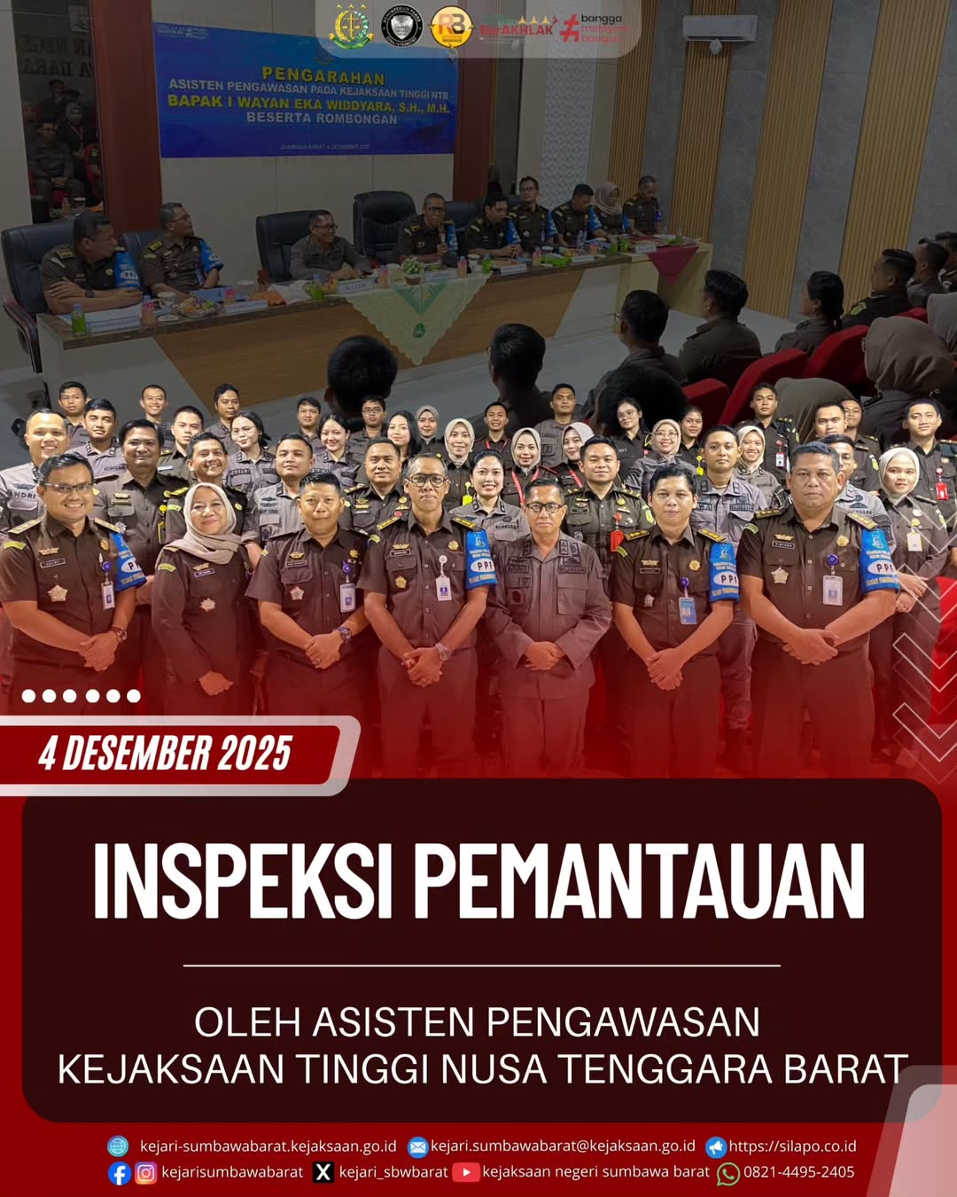 Pada hari Kamis, 4 Desember 2025. Kejaksaan Negeri Sumbawa Barat menerima Kunjungan Inspeksi Pemantauan yang dilaksanakan oleh Asisten Pengawasan pada Kejaksaan Tinggi NTB Bapak I Wayan Eka Widdyara, S.H., M.H, beserta rombongan.