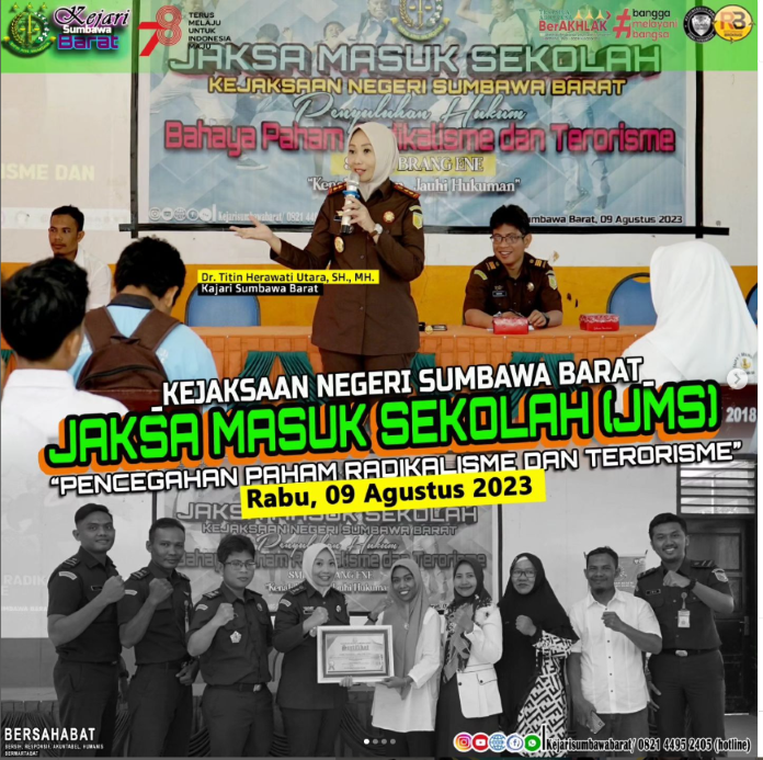 Kejaksaan Negeri Sumbawa Barat melalui bidang Intelijen melaksanakan kegiatan Penyuluhan Hukum Jaksa Masuk Sekolah (JMS) yang bertempat di SMK Negeri 1 Brang Ene Kec. Brang Ene Kab. Sumbawa Barat.
