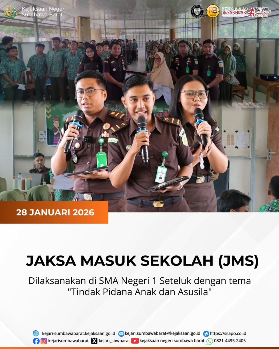 Pada hari Rabu, 28 Januari 2026. Kejaksaan Negeri Sumbawa Barat melalui bidang Intelijen, melaksanakan Penyuluhan Hukum dalam program Jaksa Masuk Sekolah (JMS) ke SMA Negeri 1 Seteluk dengan judul materi “Tindak Pidana Anak dan Tindakan Asusila” yang dipimpin langsung oleh Kasi Intel Benny Utama, S.H.