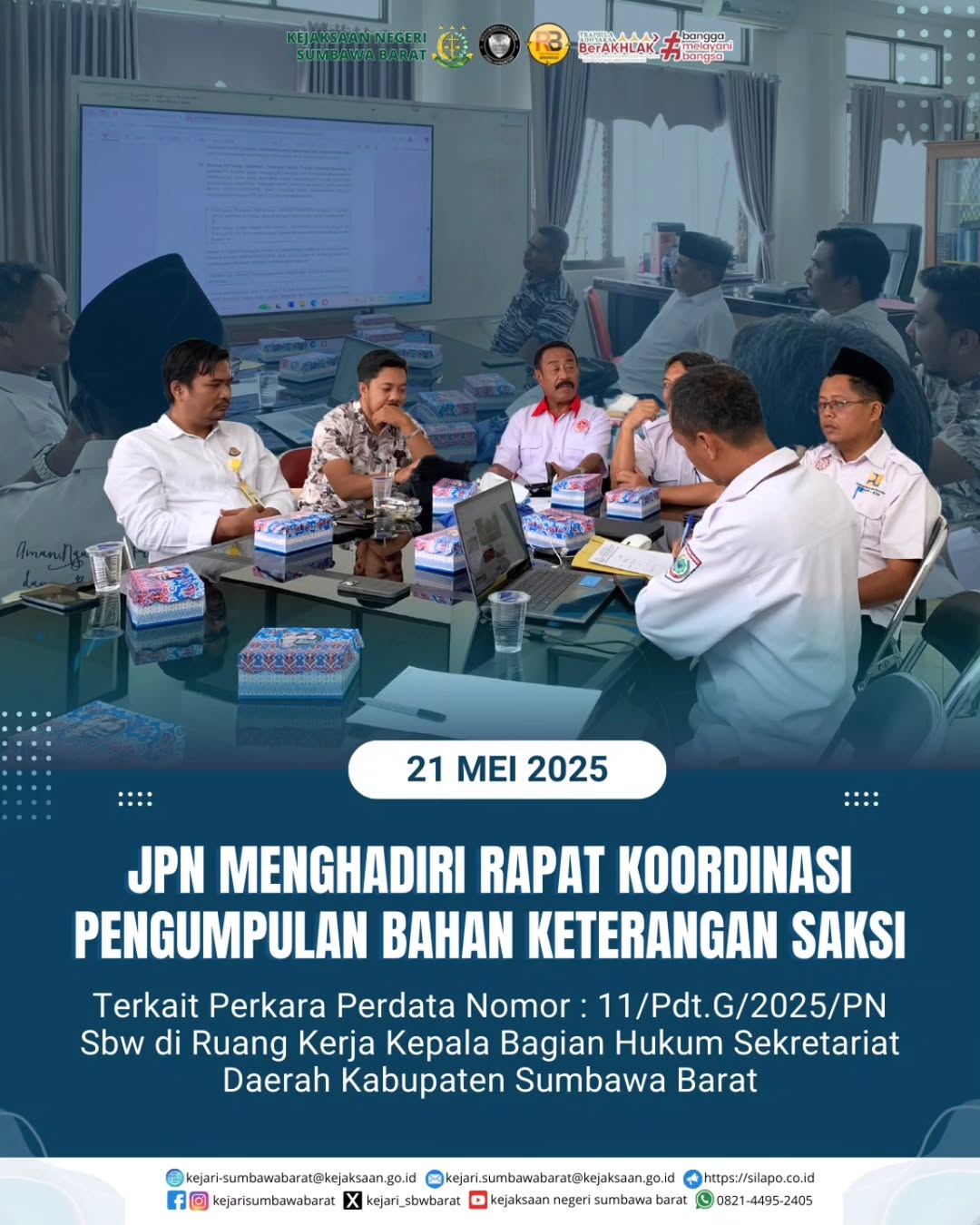 Pada hari Rabu, 21 Mei 2025 Kepala Seksi Perdata dan Tata Usaha Negara, Reza Safetsila Yusa, SH selaku Tim Jaksa Pengacara Negara menghadiri Rapat Koordinasi Pengumpulan Bahan Keterangan Saksi terkait Perkara Perdata Nomor : 11/Pdt.G/2025/PN Sbw di bertempat Ruang Kerja Kepala Bagian Hukum Sekretariat Daerah Kabupaten Sumbawa Barat.
