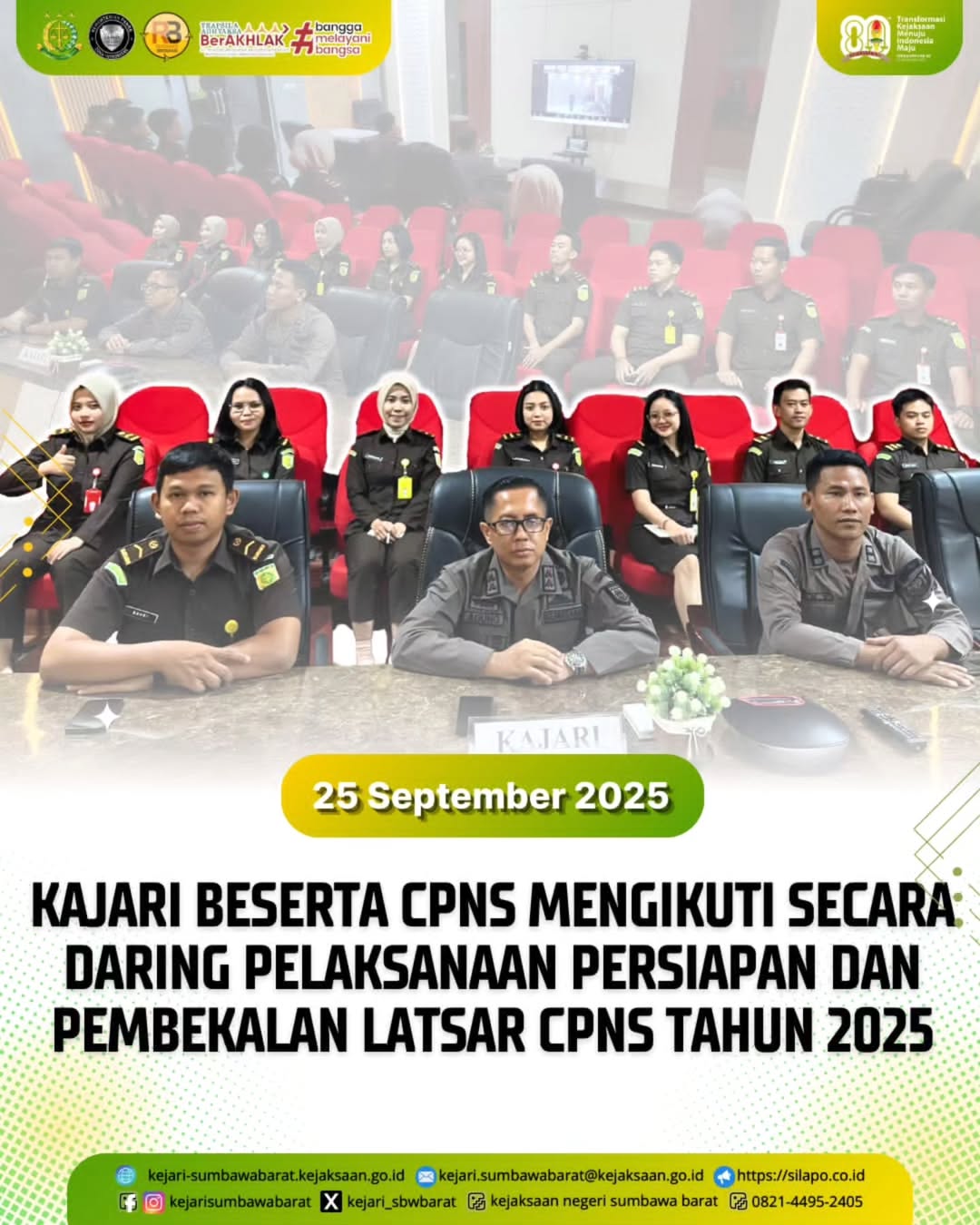 Pada hari Kamis, 25 September 2025. Kepala Kejaksaan Negeri Sumbawa Barat Bapak Agung Pamungkas, SH., MH beserta staf Pembinaan dan CPNS 2025, mengikuti kegiatan Pelaksanaan Persiapan Pembekalan Latsar CPNS tahun 2025 secara daring yang diikuti di Ruang Vicon Lt. 1 Kantor Kejari Sumbawa Barat.