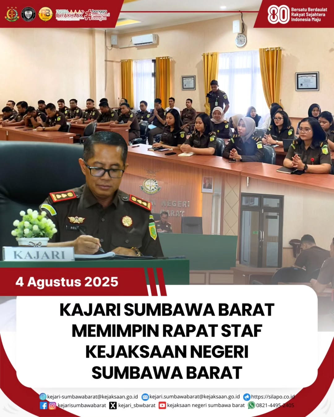 Pada hari Senin, 4 Agustus 2025.Kejaksaan Negeri Sumbawa Barat melaksanakan kegiatan Rapat Staf yang dipimpin langsung oleh Kepala Kejaksaan Negeri Sumbawa Barat Bapak Agung Pamungkas, SH., MH, bertempat di Aula Lantai 2 Kantor Kejari Sumbawa Barat.