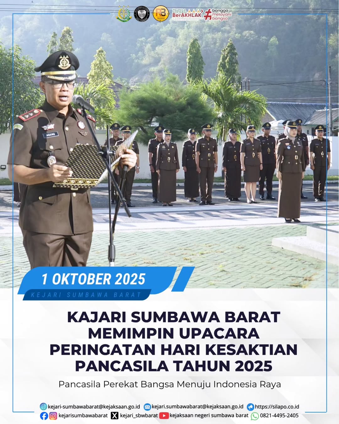 Pada hari Rabu , 1 Oktober 2025. Kepala Kejaksaan Negeri Sumbawa Barat Bapak Agung Pamungkas, SH., MH beserta para kasi, kasubsi, Jaksa dan pegawai Lainnnya melaksanakan kegiatan Upacara Peringatan Hari Kesaktian Pancasila Tahun 2025 tanggal 1 Oktober 2925 dengan mengusung tema Pancasila Perekat Bangsa Menuju Indonesia Raya.
