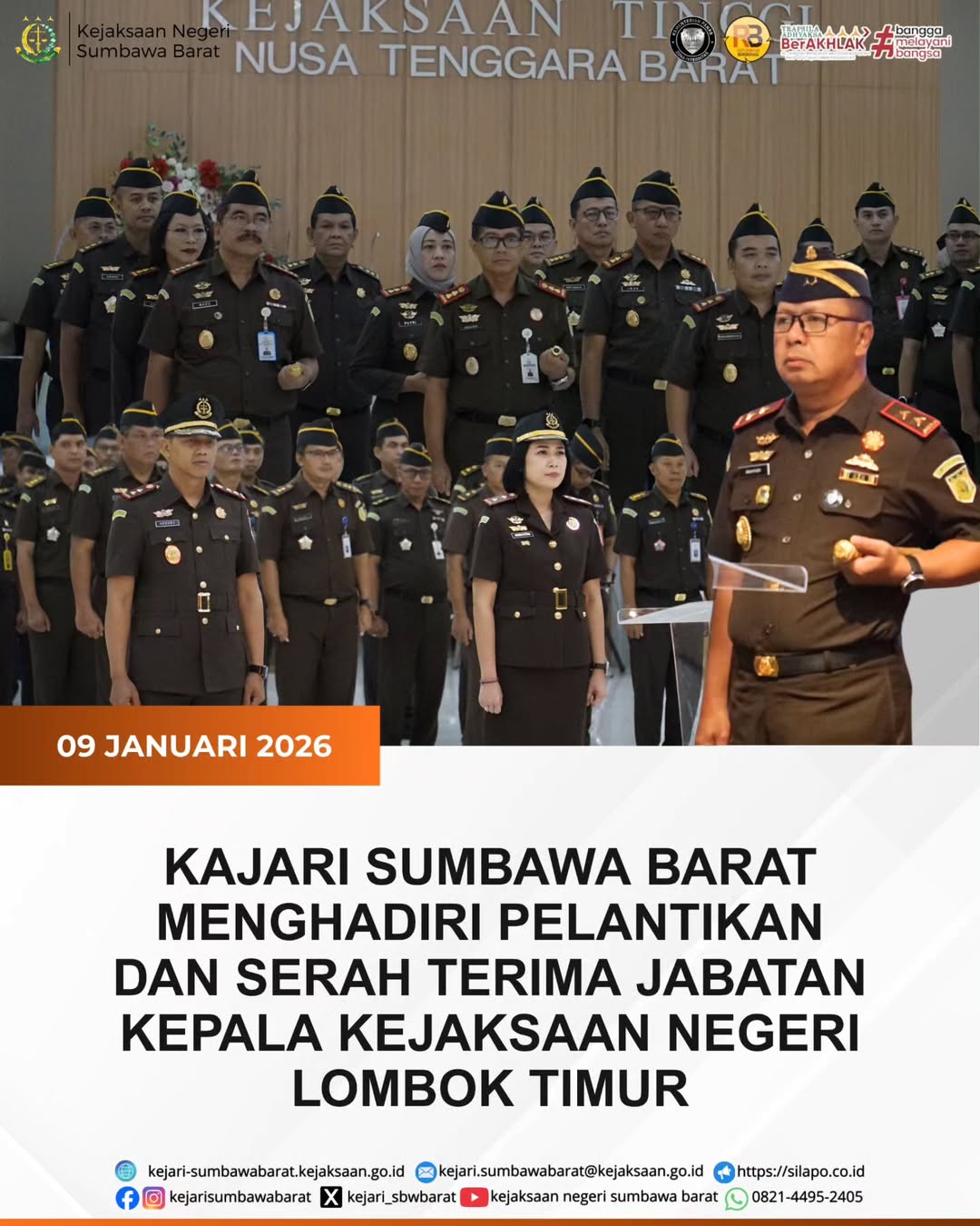 Pada hari Jum’at, 09 Januari 2026. Kepala Kejaksaan Negeri Sumbawa Barat Bapak Agung Pamungkas, S. H,. M. H, menghadiri kegiatan Pelantikan dan Serah Terima Jabatan Kepala Kejaksaan Negeri Lombok Timur yang dilaksanakan pada Aula Kantor Kejaksaan Tinggi NTB di Mataram.