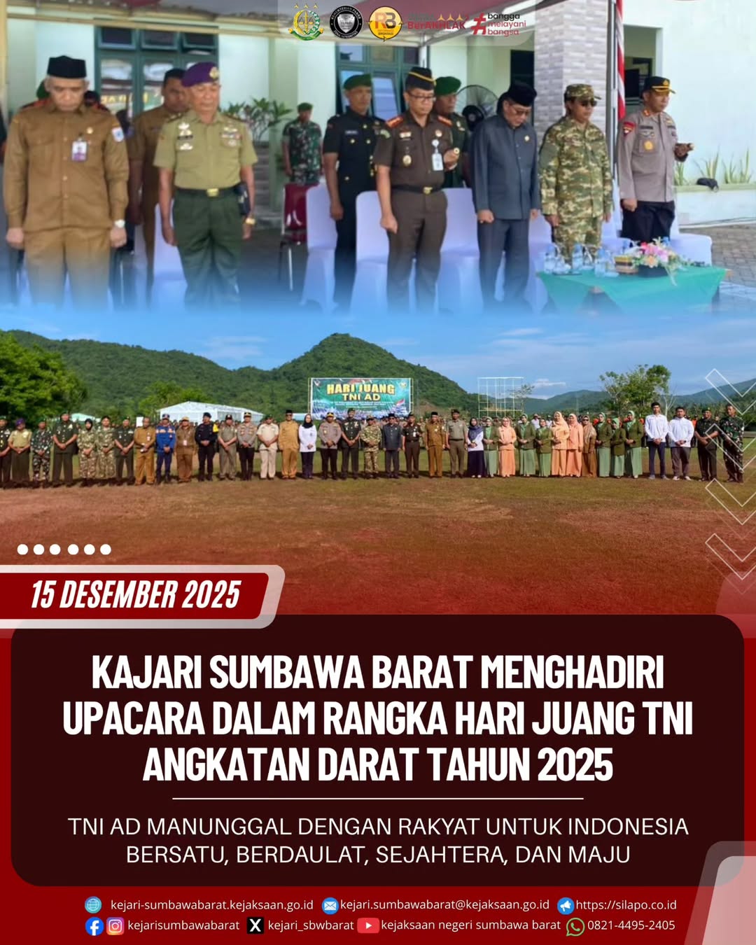Pada hari Senin, 15 Desember 2025. Kepala Kejaksaan Negeri Sumbawa Barat Bapak Agung Pamungkas, S.H,. M.H, mengikuti kegiatan Upacara Dalam Rangka Hari Juang TNI AD Tahun 2025 dengan tema TNI AD Manunggal Dengan Rakyat untuk Indonesia Bersatu, Berdaulat, Sejahtera, dan Maju.