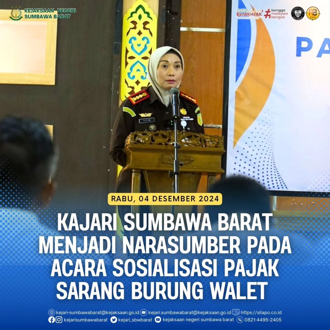 Pada Hari Rabu, 04 Desember 2024. Kepala Kejaksaan Negeri Sumbawa Barat menjadi narasumber pada acara sosialisasi pajak sarang walet bertempat di Hanipati Resto Sumbawa Barat.