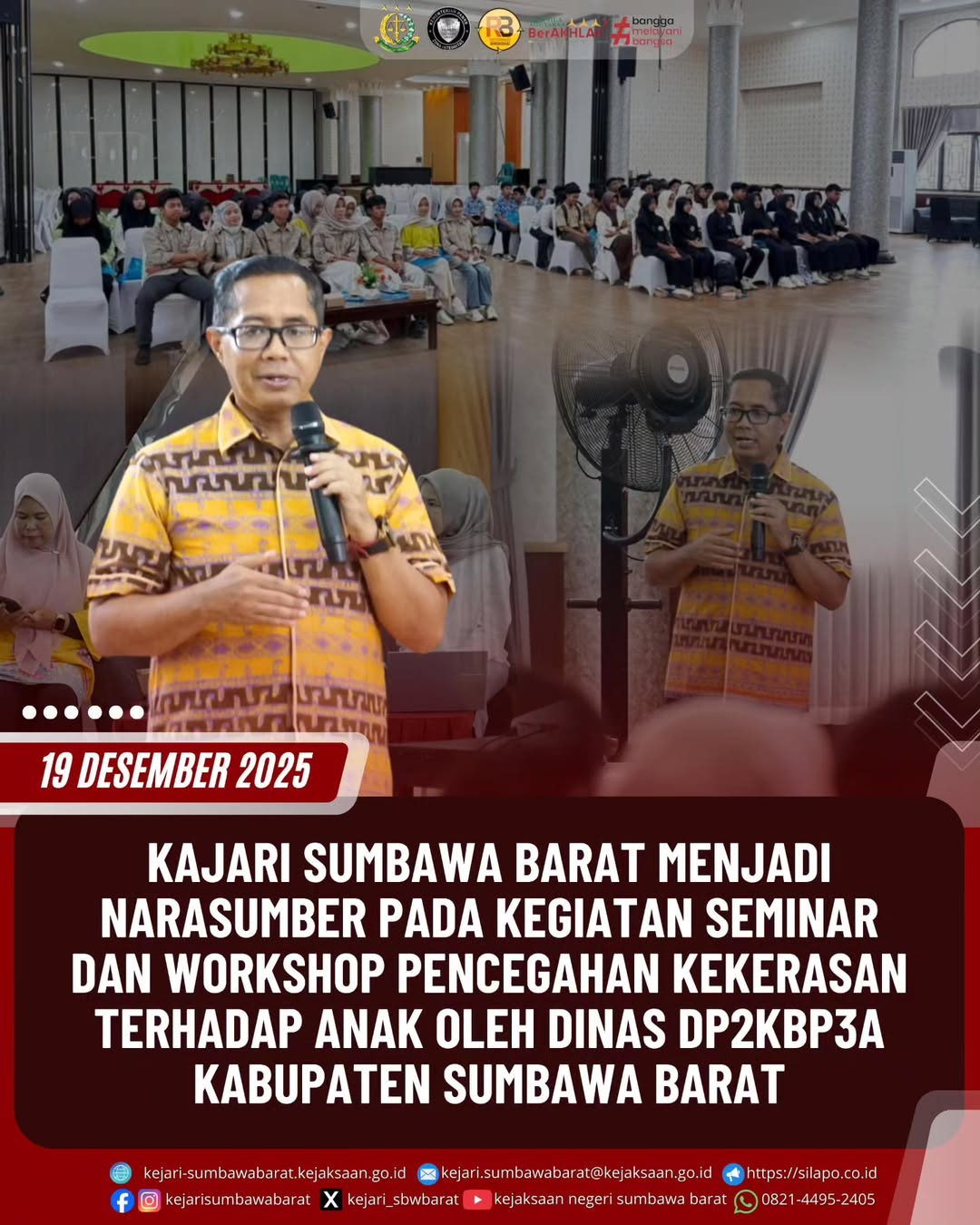 Pada hari Jum’at, 19 Desember 2025. Kepala Kejaksaan Negeri Sumbawa Barat Bapak Agung Pamungkas, S.H., M.H, menjadi pembicara pada kegiatan Seminar dan Workshop Pencegahan Kekerasan terhadap Anak yang diprakarsai oleh Dinas DP2KB3A Kab. Sumbawa Barat.
