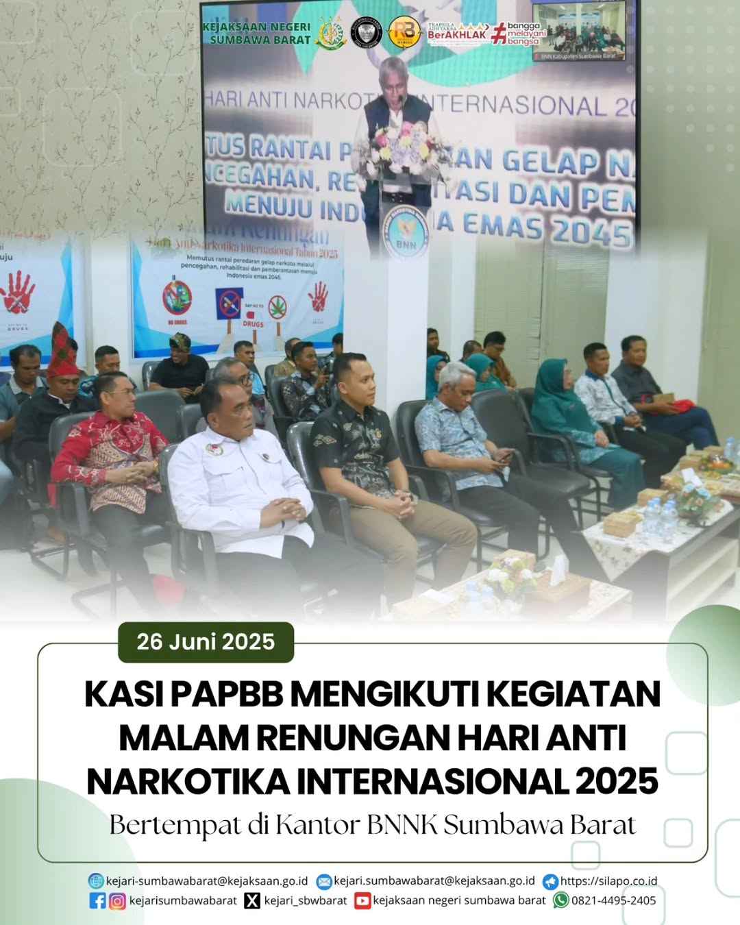 Pada hari Kamis, 26 Juni 2025. Kepala Seksi PAPBB, Andri Setiawan, SH mewakili Kepala Kejaksaan Negeri Sumbawa Barat menghadiri kegiatan malam renungan hari narkotika internasional bertempat di Kantor BNNK Sumbawa Barat.