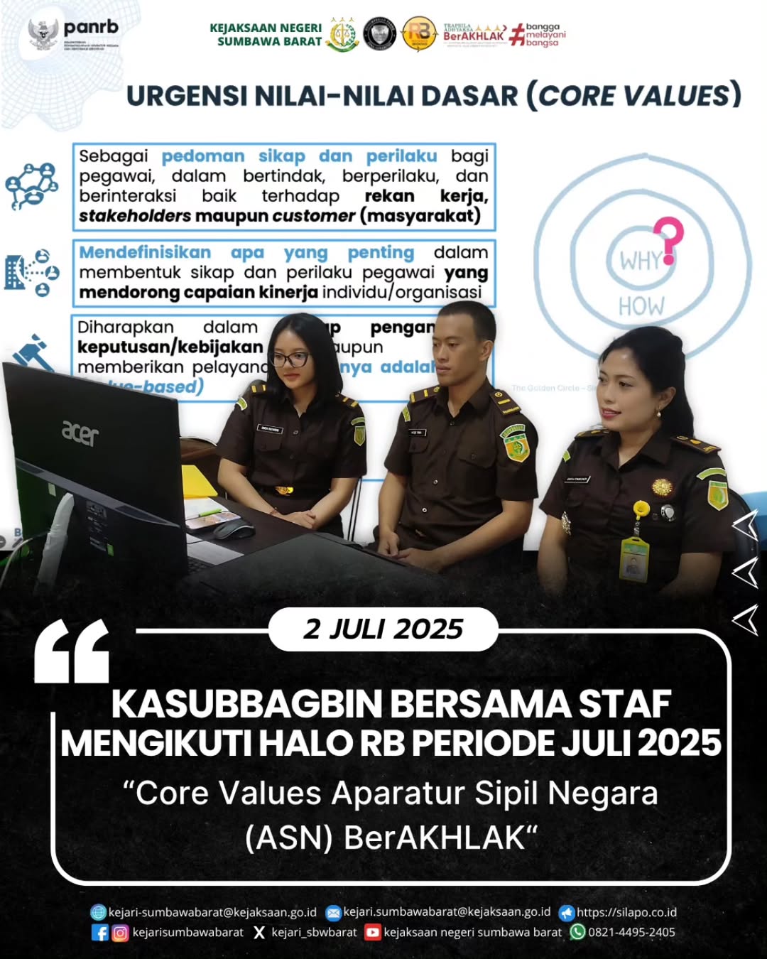 Pada hari Rabu, 02 Juli 2025 Kepala Subbagian Pembinaan beserta staf mengikuti video conference Halo RB periode Juli 2025 dengan tema “Core Values Aparatur Sipil Negara (ASN) BerAKHLAK”