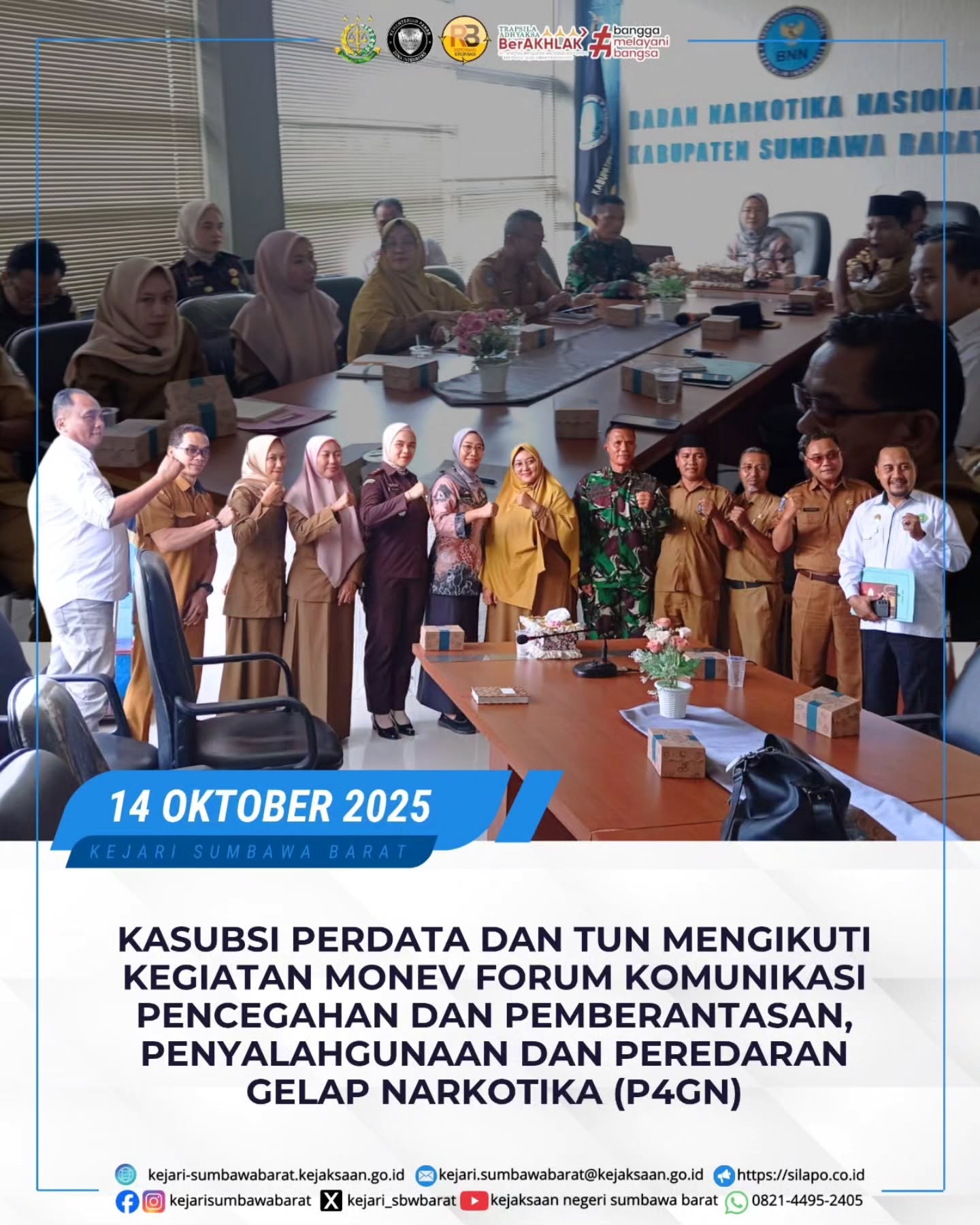Pada hari Selasa, 14 Oktober 2025. Kepala Kejaksaan Negeri Sumbawa Barat dalam hal ini diwakili oleh Kasubsi Perdata dan TUN Kejari Sumbawa Barat Ridha Rachmawati, SH beserta tim mengikuti kegiatan Monitoring dan Evaluasi (Monev) Forum Komunikasi Pencegahan dan Pemberantasan, Penyalahgunaan dan Peredaran Gelar Narkotika (P4GN) di Kab. Sumbawa Barat.