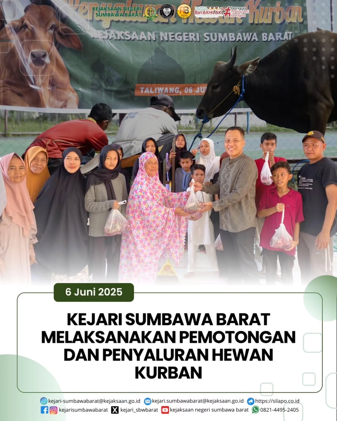 Pada hari Jum’at 06 Juni 2025. Kejaksaan Negeri Sumbawa Barat menyelenggarakan acara pemotongan dan pembagian hewan kurban yang bertempat di Halaman Kejaksaan Negeri Sumbawa Barat dalam rangka memperingati Hari Raya Idul Adha 1446 Hijriyah.