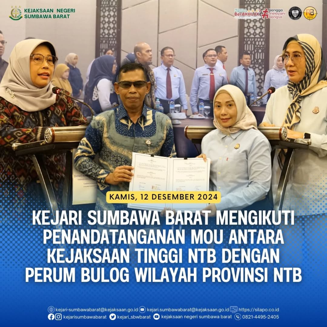 Pada hari Kamis tanggal 12 Desember 2024 bertempat di Hotel Santika Mataram, Kepala Kejaksaan Negeri Sumbawa Barat, Dr. Titin Herawati Utara, SH.,MH beserta Kasi Perdata dan Tata Usaha Negara Kejaksaan Negeri Sumbawa Barat mengikuti kegiatan penandatanganan Kesepakatan Bersama antara Kepala Perum Bulog Kantor Wilayah Nusa Tenggara Barat dengan Kepala Kejaksaan Tinggi Nusa Tenggara Barat dan antara Kepala Cabang Perum Bulog Se-Nusa Tenggara Barat dengan Kepala Kejaksaan Negeri Se-Nusa Tenggara Barat tentang Penanganan Masalah Hukum Perdata dan Tata Usaha Negara.