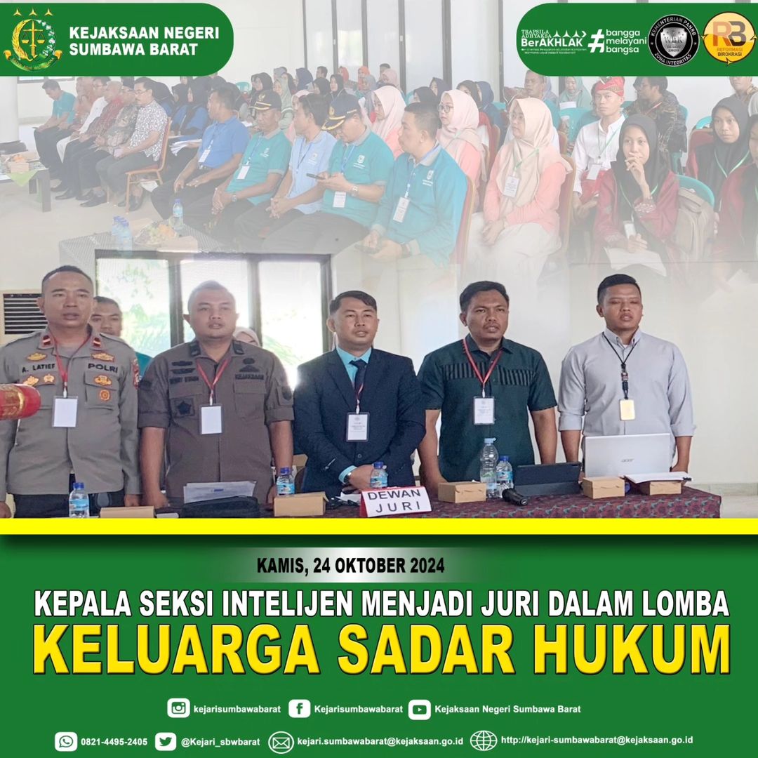 Pada hari Kamis, 24 Oktober 2024 Kepala Seksi Intelijen, Benny Utama, SH menjadi juri dalam Lomba Keluarga Sadar Hukum (KADARKUM) tingkat Kabupaten Sumbawa Barat yang diselenggarakan oleh Pemda Kab. Sumbawa Barat bertempat di Sekretariat Daerah Kab. Sumbawa Barat.