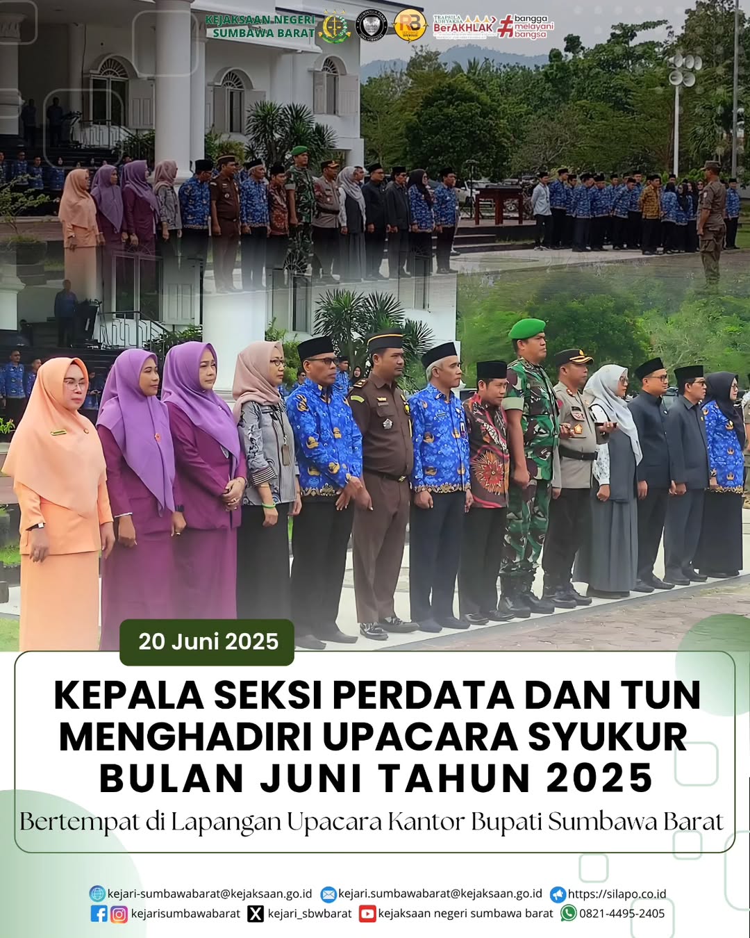 Pada hari, Jum’at, 20 Juni 2025. Kasi Perdata dan TUN Bapak Reza Safetsila Yusa, S.H mewakili Kepala Kejaksaan Negeri Sumbawa Barat menghadiri upacara Syukur bulan Juni tahun 2025 bertempat di Lapangan Graha Fitrah-KTC.
