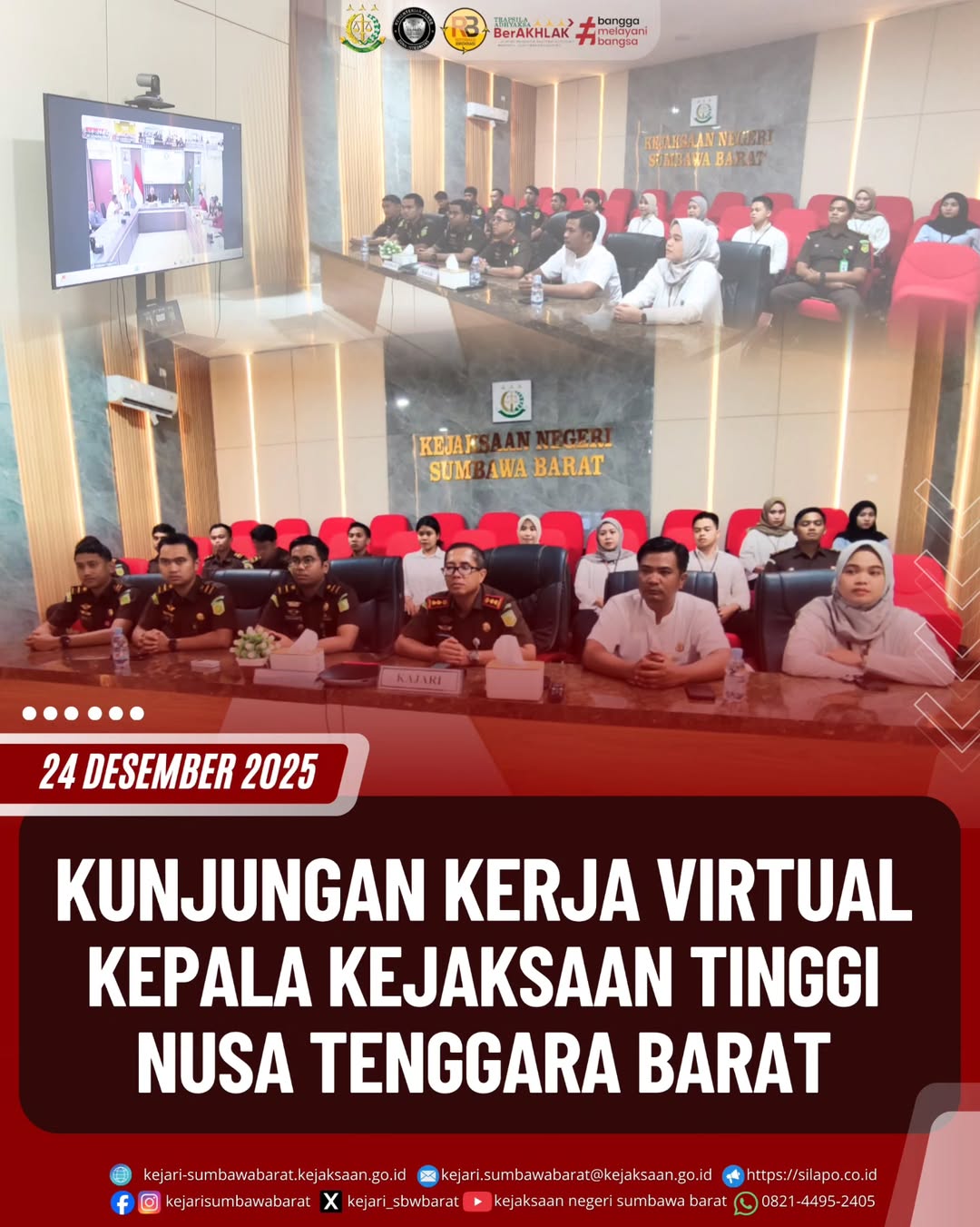 Pada hari Rabu, 24 Desember 2025. Kepala Kejaksaan Negeri Sumbawa Barat Bapak Agung Pamungkas, S.H., M.H, beserta seluruh jajaran mengikuti pengarahan dari Kepala Kejaksaan Tinggi Nusa Tenggara Barat Bapak Wahyudi, S.H., M.H melalui media daring di Aula Vicon Lt. 1 Kantor Kejari Sumbawa Barat.