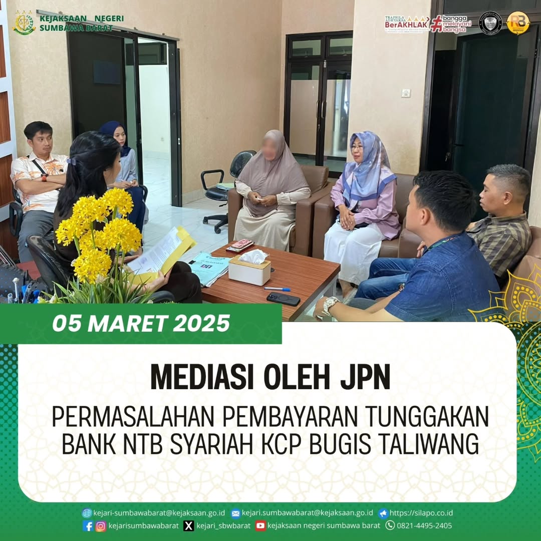 Pada hari Rabu, 05 Maret 2025, Kepala Seksi Perdata & Tun, Reza Safetsila Yusa, SH bersama Tim JPN kejari Sumbawa Barat telah dilaksanakan Mediasi atas Permohonan Bantuan Hukum dari Bank NTB Syariah KCP Bugis Taliwang.
