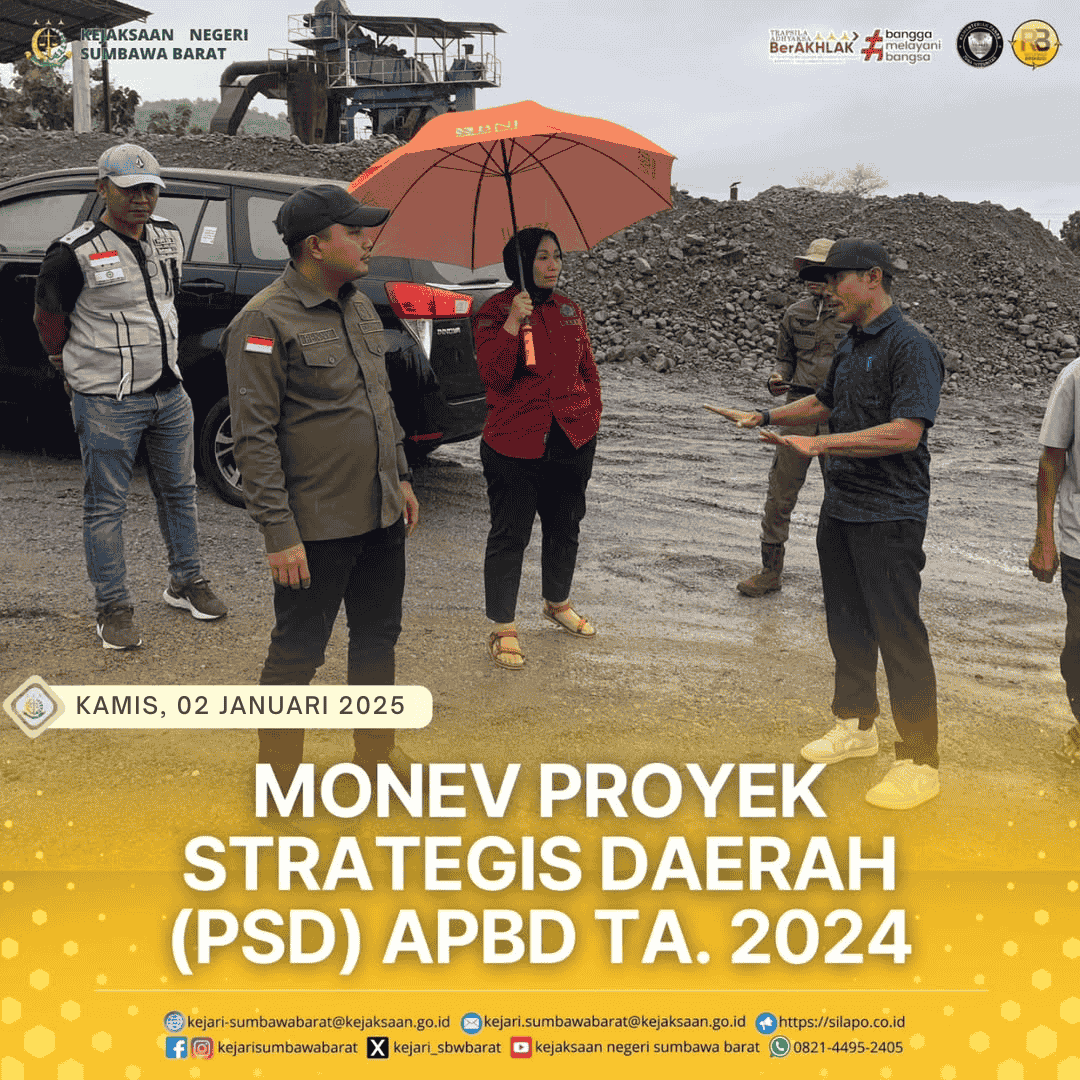 Pada hari Kamis, tanggal 2 Januari 2025. Kepala Kejaksaan Negeri Sumbawa Barat, Dr. Titin Herawati Utara, SH.,MH didampingi Kepala Seksi Intelijen melaksanakan Kegiatan Pengecekan Lapangan Proyek Strategis Daerah (PSD) Kab. Sumbawa Barat T.A. 2024.