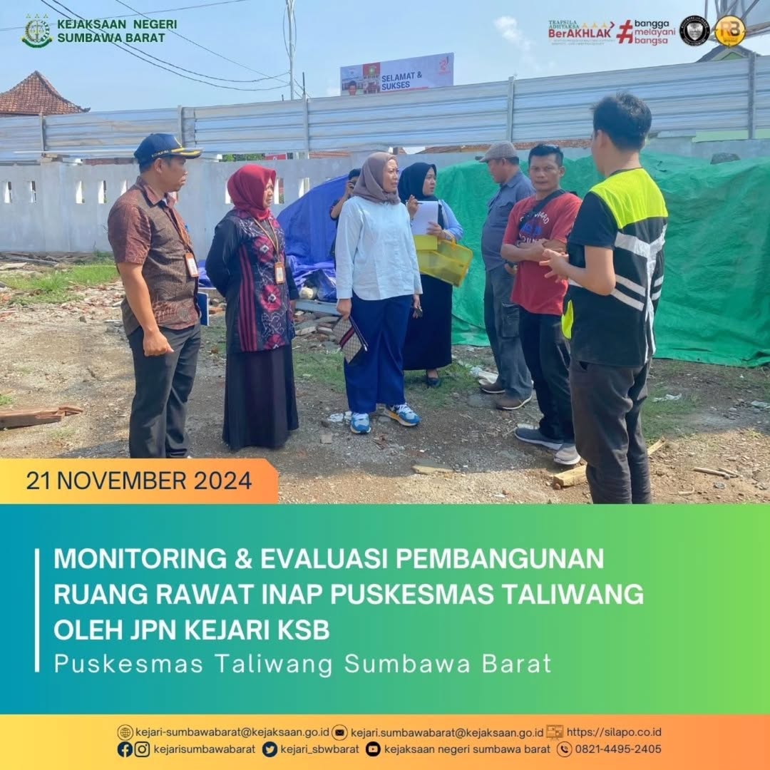 Pada hari kamis tanggal 21 November 2024, Kepala Kejaksaan Negeri Sumbawa Barat Ibu Dr. Titin Herawati Utara, SH,. MH, bersama tim Jaksa Pengacara Negara (JPN) melakukan kegiatan Peninjauan lokasi Pekerjaan Pendampingan Hukum Dinas Kesehatan Kabupaten Sumbawa Barat terkait Pembangunan Rehab Rawat Jalan Puskesmas Taliwang