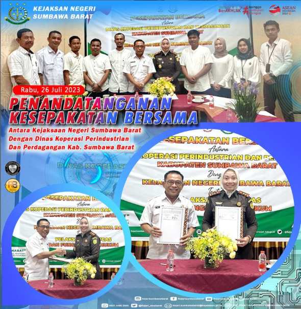 Kepala Kejaksaan Negeri Sumbawa Barat Dr. Titin Herawati Utara, SH., MH dan Kepala Dinas Koperasi Perindustrian dan Perdagangan Kab. Sumbawa Barat Ir. Lalu Muhammad Azhar, MM Melaksanakan penandatanganan Kesepakatan Besama dalam bidang Perdata dan Tata Usaha Negera. yang bertempat di Aula Kejaksaan Negeri Sumbawa Barat.