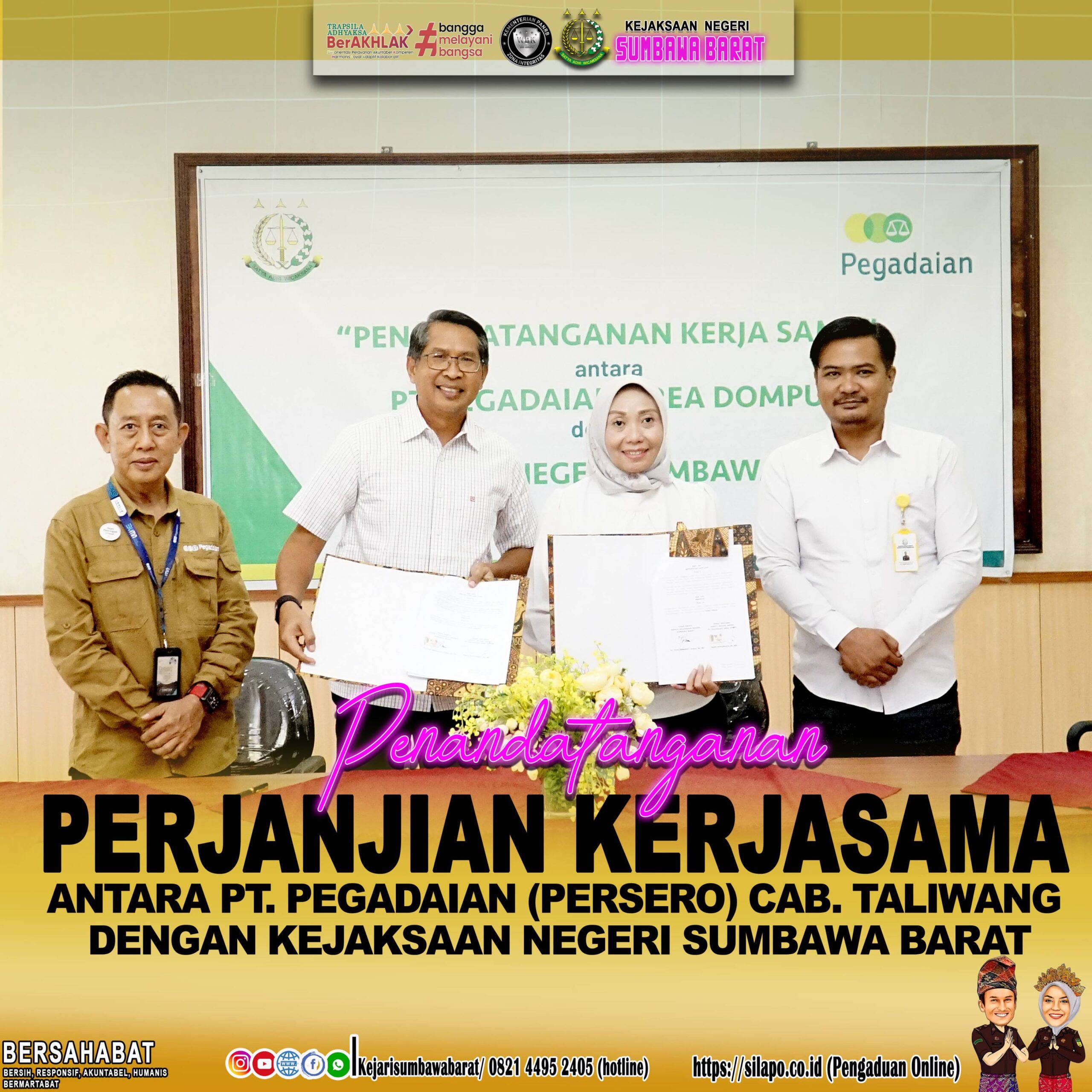 Kepala Kejaksaan Negeri Sumbawa Barat Ibu Dr. Titin Herawati Utara, SH., MH. Didampingi oleh Kasi Bidang Perdata dan Tata Usaha Negera Reza Safetsila Yusa, SH. Bersama tim, melakukan kegiatan Penandatanganan Perjanjian Kerjasama Antara PT. Pegadaian (Persero) Area Dompu dengan Kejaksaan Negeri Sumbawa Barat yang berlangsung di Aula Kantor Kejaksaan Negeri Sumbawa Barat.