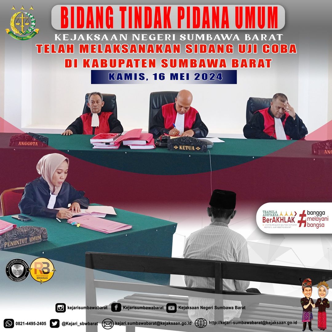 Telah dilaksanakan persidangan uji coba yang bertempat di Lantai 3 Gedung Setda Kabupaten Sumbawa Barat, yang dihadiri oleh Majelis Hakim, Penuntut Umum, Penasehat Hukum, Panitera dan Saksi, sedangkan Para Terdakwa yang berada di Lapas Sumbawa dilaksanakan melalui daring/zoom.