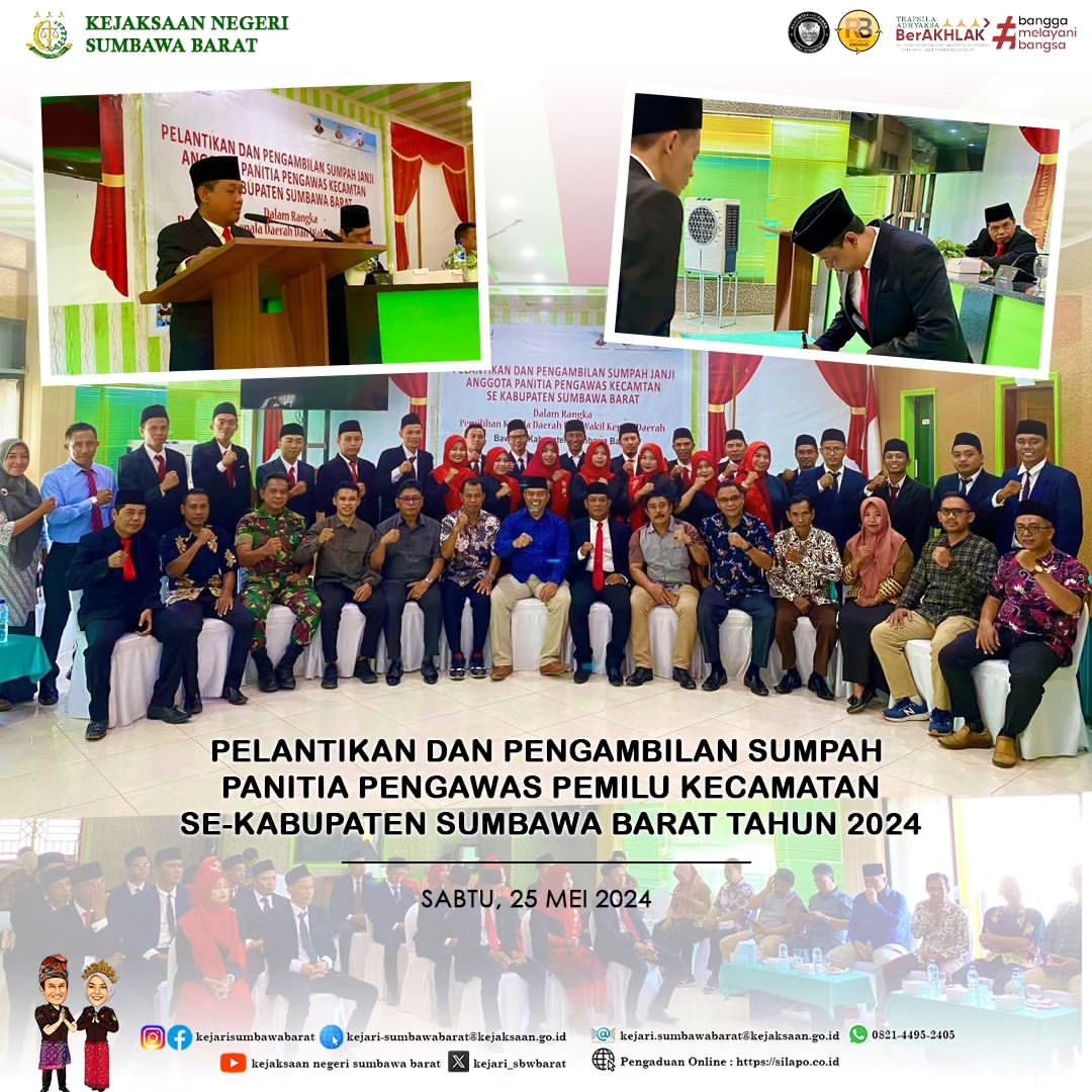 Kejaksaan Negeri Sumbawa Barat ikut menghadiri kegiatan pelantikan dan pengambilan sumpah panitia pengawasan pemilu kecamatan Se- Kab. Sumbawa Barat Tahun 2024.