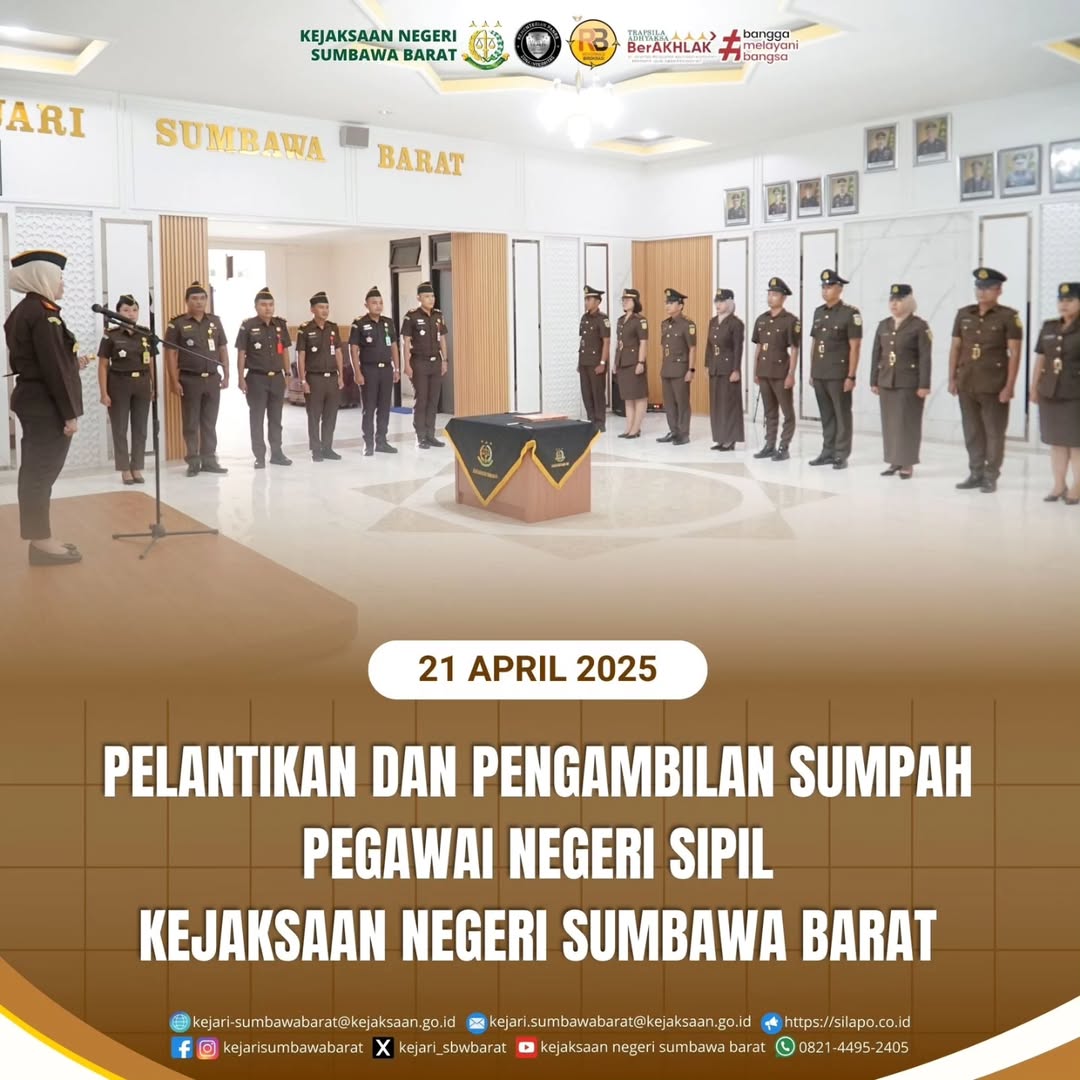 Pada hari Senin, 21 April 2025. Bertempat di Aula Kejari Sumbawa Barat, telah dilaksanakan upacara pelantikan dan pengambilan sumpah Pegawai Negeri Sipil (PNS) dilingkungan Kejaksaan Negeri Sumbawa Barat yang diikuti oleh 14 Calon Pegawai Negeri Sipil. Upacara dipimpin langsung oleh Kepala Kejaksaan Negeri Sumbawa Barat, Dr. Titin Herawati Utara, SH.,MH dan dihadiri oleh Kasubag dan para kasi dilingkungan Kejaksaan Negeri Sumbawa Barat.