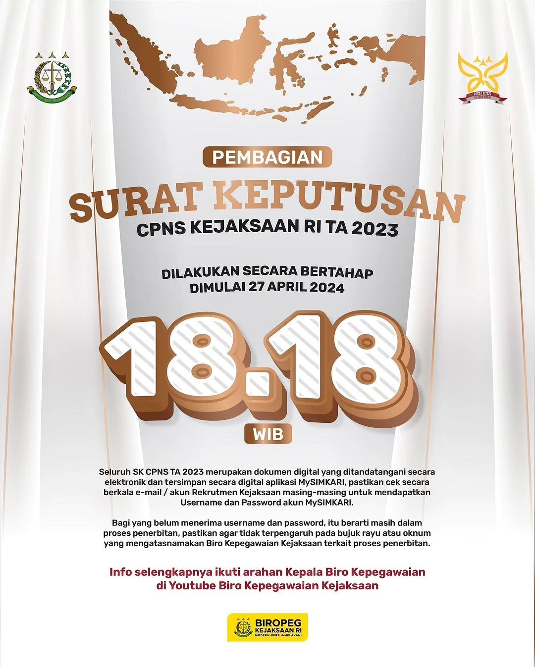 Sebagai bentuk pelayanan Biro Kepegawaian yang akuntabel dan profesional, kami mengoptimalkan pembagian SK CPNS secara simultan dan efektif, yang artinya seluruh CPNS mulai diberikan SK CPNS secara bertahap kepada yang berkasnya telah lengkap, melalui email elektronik yang ditujukan kepada masing-masing peserta, sedangkan para CPNS yang belum menerima SK CPNS-nya agar bersabar dalam proses perbaikan berkas, kami menjamin tidak ada perbedaan perlakuan maupun transaksional tertentu, karena semua akan menerima SK pada waktunya. Jangan percaya pada oknum yang menjanjikan pengurusan SK diluar Biropeg.