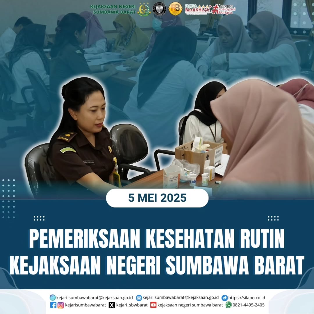 Pada hari Senin, 05 Mei 2025. Telah dilaksanakan Kegiatan Pengecekan Kesehatan Rutin Pegawai Kejaksaan Negeri Sumbawa Barat Oleh Jajaran Petugas Kesehatan dari RSUD Asy-Syifa Kab. Sumbawa Barat.