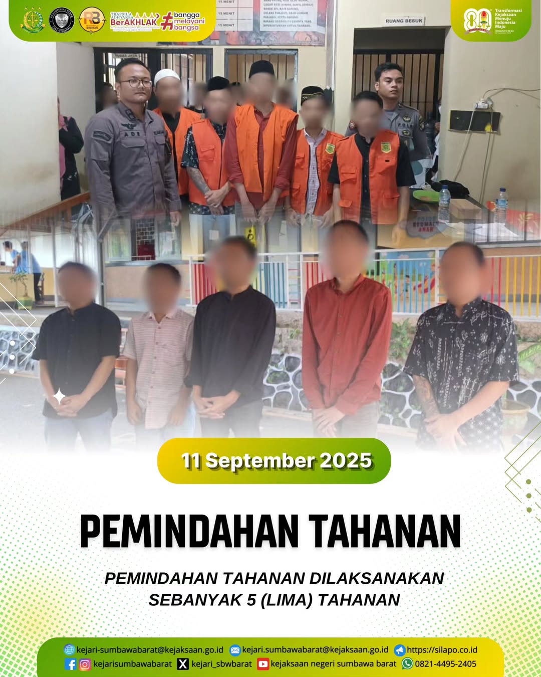 Pada hari Kamis, 11 September 2025. Tim Jaksa Penuntut Umum (JPU) pada Kejaksaan Negeri Sumbawa barat dengan Pengawal Tahanan kejari Sumbawa Barat dibantu personil Polres Sumbawa Barat melaksanakan pemindahan tahanan menuju Lapas Kelas IIA Sumbawa Besar sebanyak 5 (lima) orang tahanan.