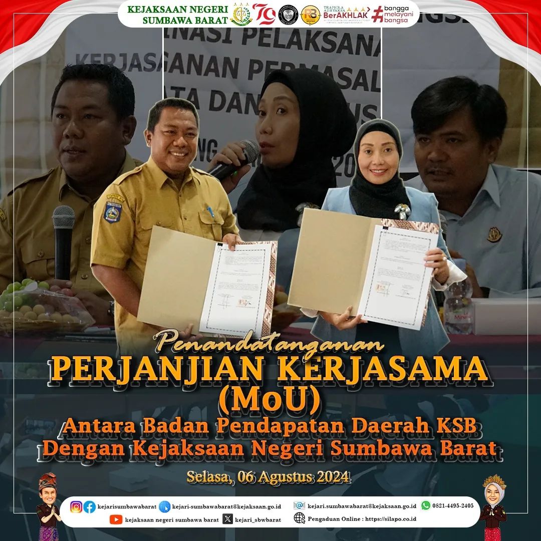 Pada Hari Selasa, 06 Agustus 2024.Bertempat di Aula Kantor Kejaksaan Negeri Sumbawa Barat telah dilaksanakan kegiaya Penandatanganan Perjanjian Kerjasama (MoU) antara Badan Pendapatan Daerah Kabupaten Sumbawa Barat dengan Kejaksaan Negeri Sumbawa Barat.
