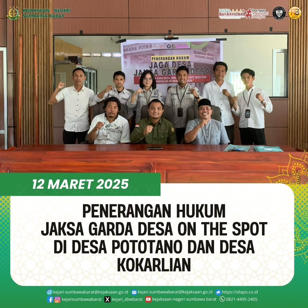 Bahwa pada hari Rabu, 12 Maret 2025, Kepala Seksi Intelijen, Benny Utama, SH bersama tim Penerangan Hukum melakukan kegiatan Penerangan Hukum Jaksa Garda Desa (Jaga Desa) tahun 2025 dengan Judul Pemanfaatan Dana Desa, Inventarisasi Aset Desa dan Pengenalan Aplikasi Jaga Desa di Desa Poto Tano dan Desa Kokarlian yang berada di Kec. Poto Tano Kab. Sumbawa Barat.