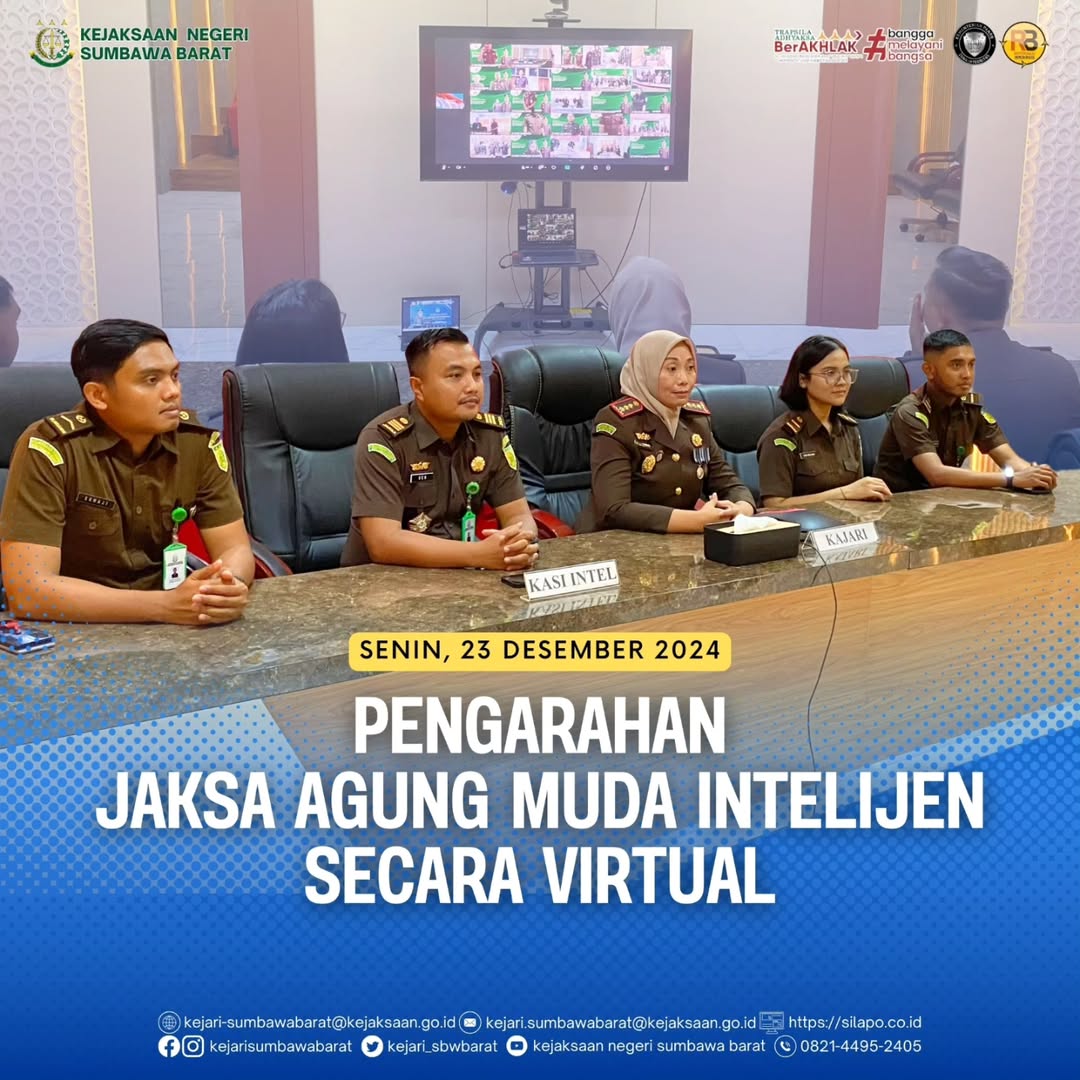 Pada Hari Senin Tanggal 23 Desember 2024. Kepala Kejaksaan Negeri Sumbawa Barat Ibu Dr. Titin Herawati Utara, S.H., M.H bersama dengan tim Intelijen menghadiri secara virtual pengarahan Jaksa Agung Muda Intelijen bertempat di Ruang Vicon Kejari Sumbawa Barat.