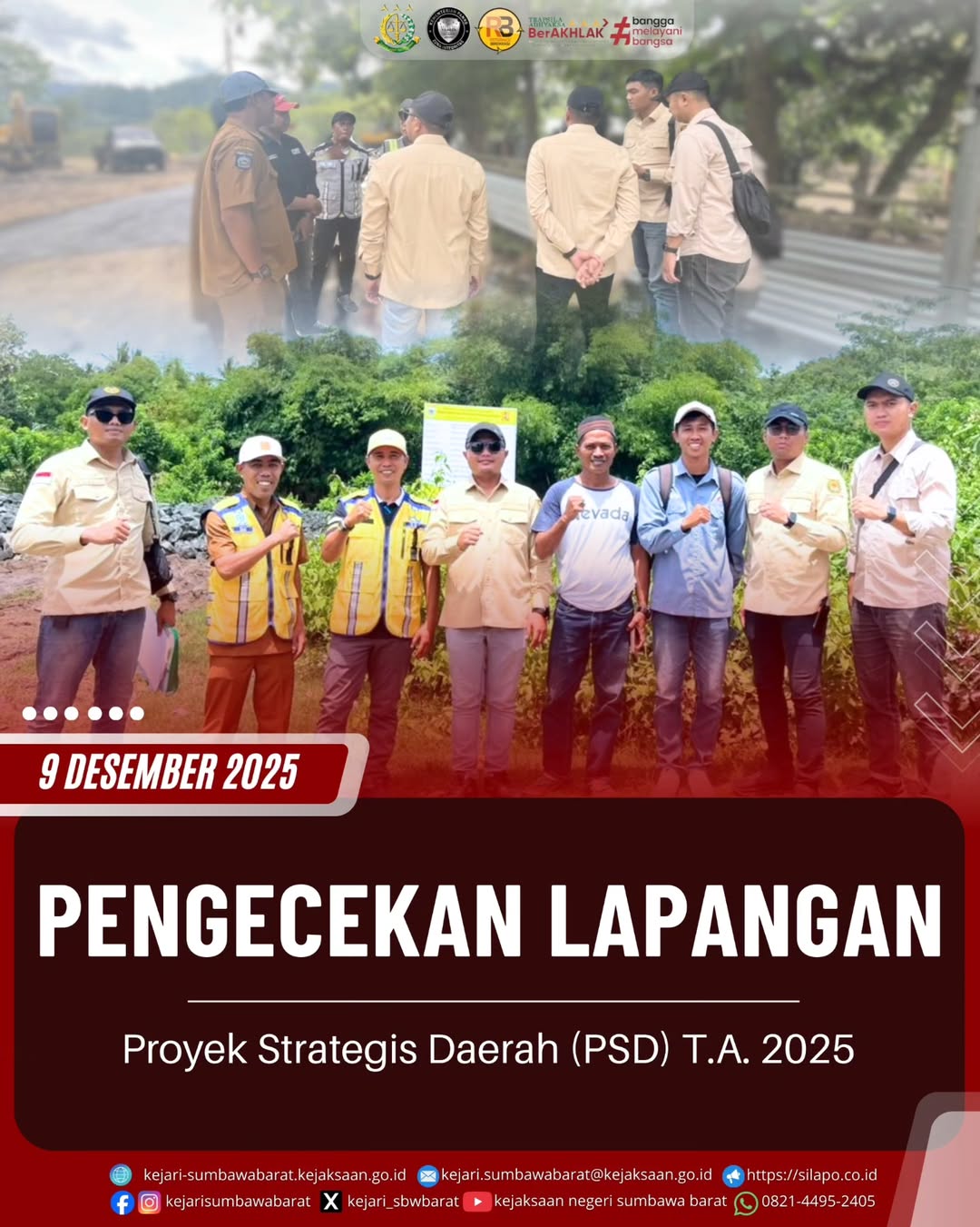 Pada hari Selasa, 9 Desember 2025. Telah dilakukan Pengecekan Lokasi/ turun lapangan Proyek Strategis Daerah (PSD) Kab. Sumbawa Barat T.A. 2025 yang dilaksanakan oleh Tim gabungan yang terdiri dari Tim PSD Kejari Sumbawa Barat dan Dinas PUPR Kab. Sumbawa Barat menuju ke 5 titik pekerjaan yang dipimpin langsung oleh Kasi Intelijen Benny Utama, S.H, beserta tim PSD
