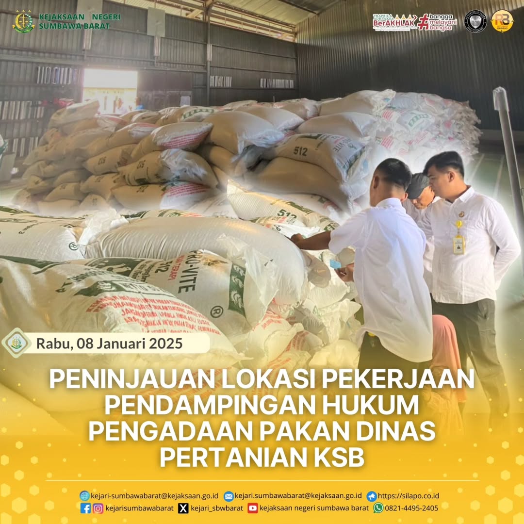 Pada hari Rabu tanggal 08 Januari 2025, Jaksa Pengacara Negara Reza Safetsila Yusa, SH melaksanakan Peninjauan lokasi / cek lapangan kegiatan Pendampingan Hukum Pengadaan Pakan Ayam Dinas Pertanian Kabupaten Sumbawa Barat yang berlokasi di Gudang penampung CV. Tiga Mutiara Bima Desa Manemeng Kec. Brang Ene Kabupaten Sumbawa Barat.