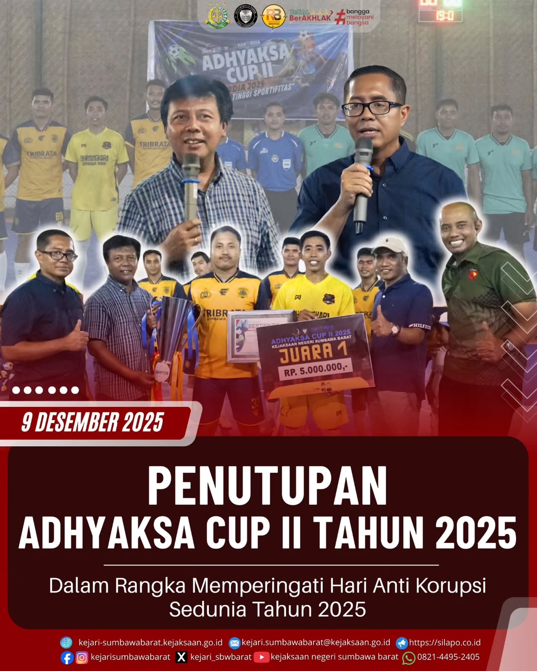 Pada hari Selasa, 9 Desember 2025. kegiatan Final Adhyaksa Cup II Tahun 2025 mempertemukan Polres Sumbawa Barat dengan Dinas Sosial Kab. Sumbawa Barat dengan hasil kemenangan dari Polres Sumbawa Barat dengan skor 5:1, sehingga rincian juara pada kompetisi Futsal Adhyaksa Cup II Tahun 2025, diantaranya: