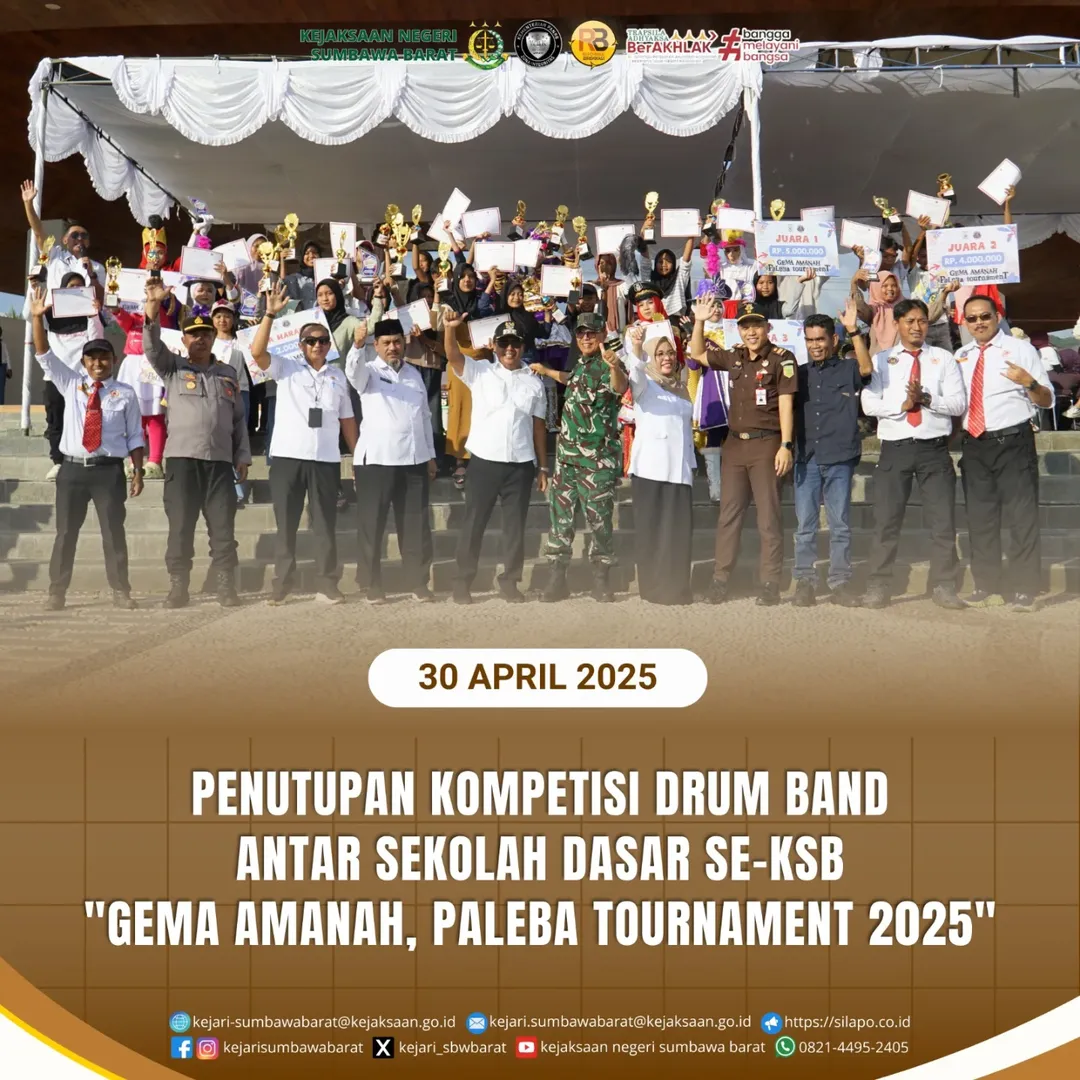 Pada hari Rabu, 30 April 2025 bertempat di Alun-Alun Kota Taliwang Sumbawa Barat, Kajari Sumbawa Barat diwakili kasi PAPBB Bapak Andri Setiawan, S.H menghadiri kegiatan Penutupan Kompetisi Drum Band Antar Sekolah Dasar Se-KSB ” Gema Amanah, Paleba Tournament 2025″.