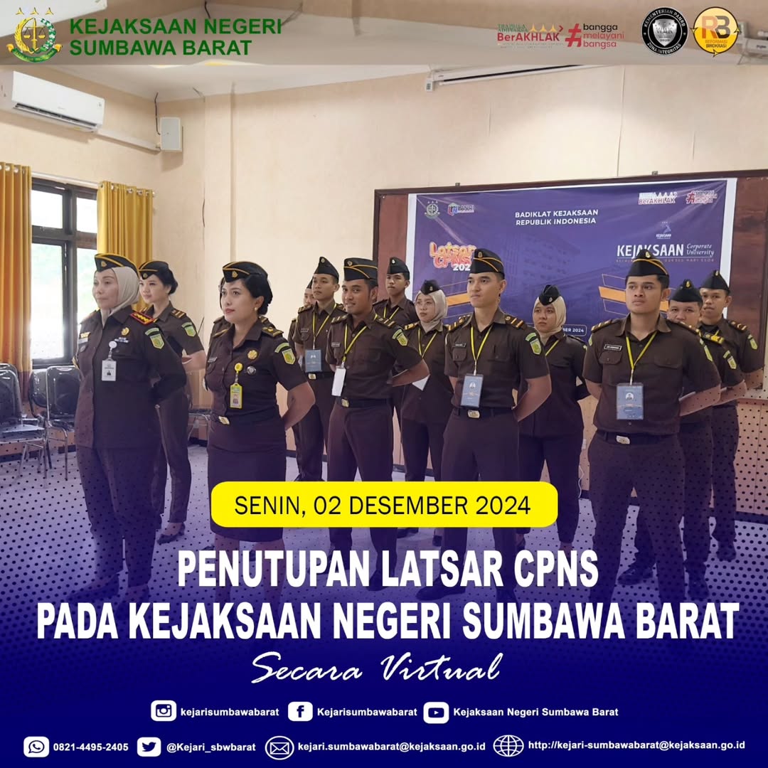 Pada Hari Senin, 02 Desember 2024. Kepala Kejaksaan Negeri Sumbawa Barat, Dr. Titin Herawati Utara, SH.,MH didampingi Kepala Sub Bagian Pembinaan Mengikuti Video Conference dalam rangka penutupan Latihan Dasar (LATSAR) CPNS pada Kejaksaan Negeri Sumbawa Barat Bertempat di Aula Kantor Kejaksan Negeri Sumbawa Barat.