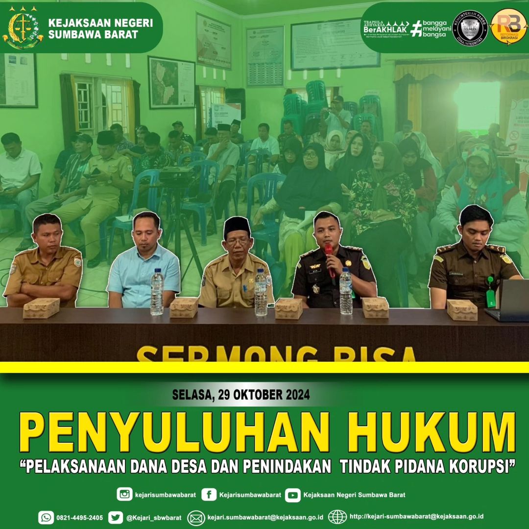 Pada Hari Selasa 29 Oktober 2024 Kepala Seksi Intelijen, Benny Utama, SH mewakili Kepala Kejaksaan Negeri Sumbawa Barat menjadi Narasumber dalam kegiatan Penyuluhan Hukum bagi masyarakat Desa Sermong tentang “Pelaksanaan Dana Desa dan Penindakan Tindak Pidana Korupsi di Desa Sermong Kecamatan Taliwang Kabupaten Sumbawa Barat Tahun 2024” bertempat di Aulah Kantor Desa sermong.