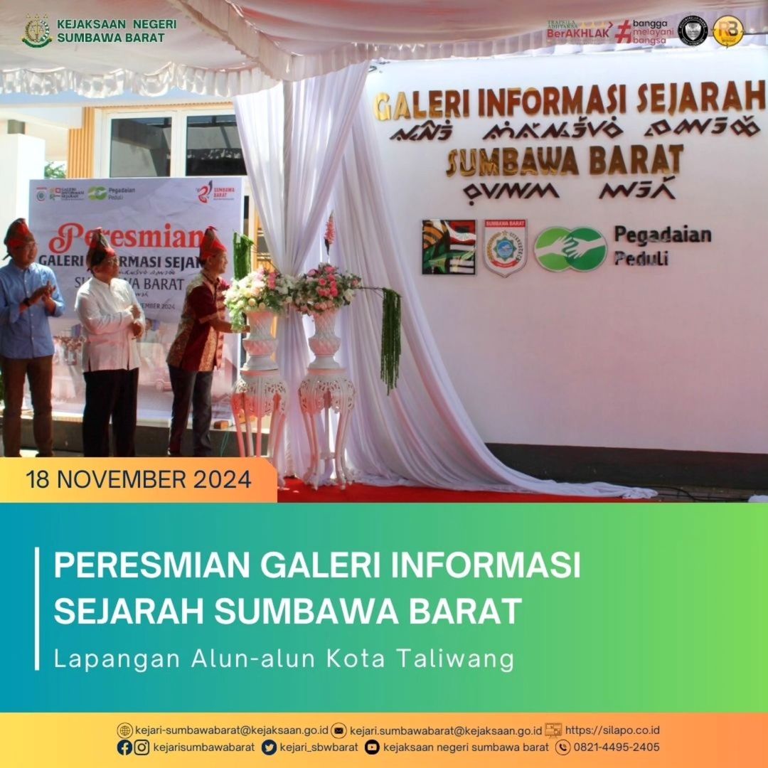 Pada Hari Senin,18 November 2024 Kepala Seksi Intelijen, Benny Utama, S.H. Mewakili Kepala Kejaksaan Negeri Sumbawa Barat dalam kegiatan Peresmian Galeri Informasi Sejarah Sumbawa Barat bertempat di Lapangan Alun-alun Kota Taliwang Kab.Sumbawa Barat