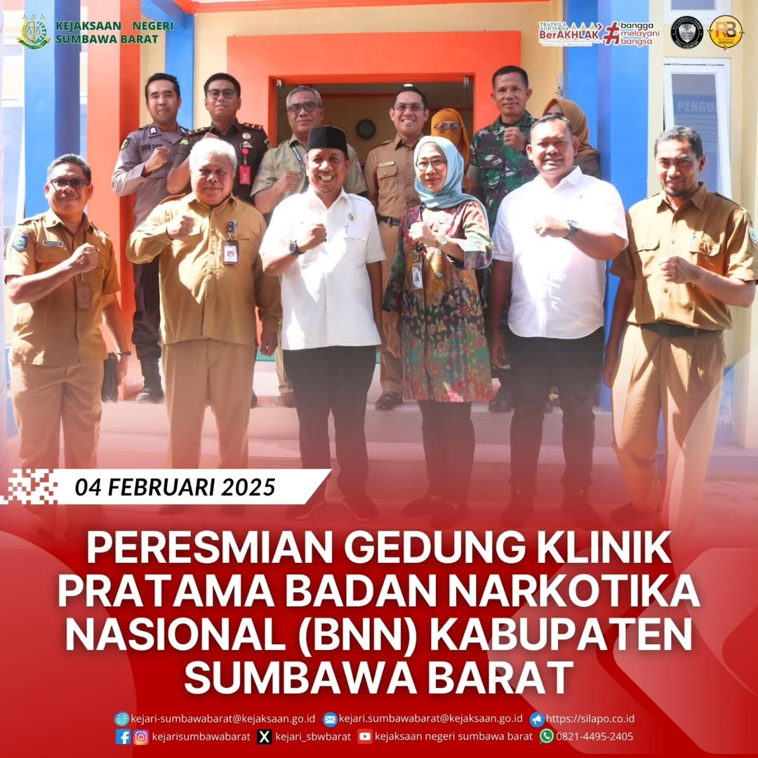 Pada hari Selasa, 04 Februari 2025. Kepala Kejaksaan Negeri Sumbawa Barat di wakili oleh Jaksa Fungsional, Pahrul Taufik Dalimunthe, SH menghadiri kegiatan peresmian gedung Klinik Pratama Badan Narkotika Nasional (BNN) Kabupaten Sumbawa Barat.