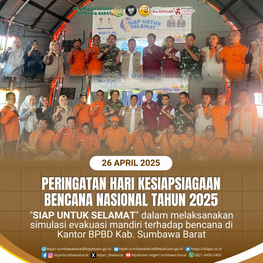 Pada hari Sabtu, 26 April 2025. Kepala Kejaksaan Negeri Sumbawa Barat diwakili oleh Jaksa Fungsional, Pahrul Taufik Dalimunthe, SH menghadiri kegiatan perinhatan hari kesiapsiagaan bencana nasional tahun 2025 dengan tema “SIAP UNTUK SELAMAT” dalam melaksanakan simulasi evakuasi mandiri terhadap bencana bertempat di Kantor BPBD Kab. Sumbawa Barat.