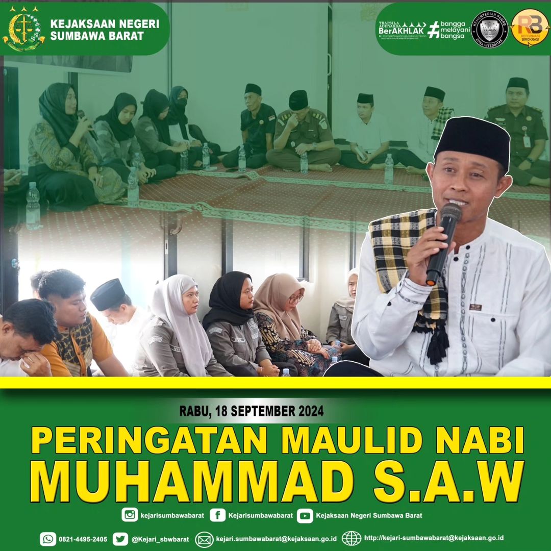 Pada hari Rabu, 18 September 2024. Kejaksaan Negeri Sumbawa Barat melaksanakan kegiatan memperingati Maulid Nabi Muhammad SAW dengan menggelar pengajian yang dilaksanakan di Musholla Ad-Dhuha’ Kantor Kejaksaan Negeri Sumbawa Barat.