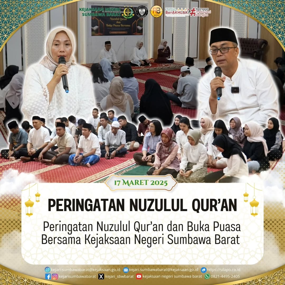 Pada hari Senin, 17 Maret 2025. Kejaksaan Negeri Sumbawa Barat menggelar peringatan nuzulul qur’an yang dihadiri langsung oleh Kepala Kejaksaan Negeri Sumbawa Barat, Dr. Titin Herawati Utara, SH.,MH beserta Seluruh Pegawai.