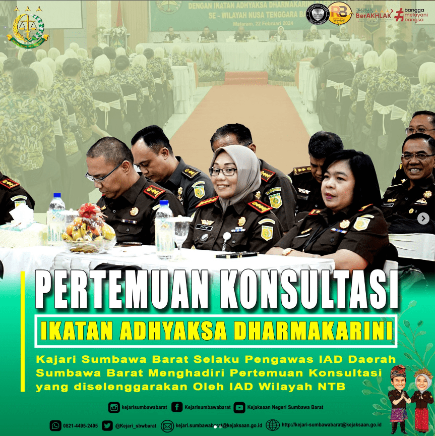 Pada Hari Kamis, 22 Februari 2024. Kepala Kejaksaan Negeri Sumbawa Barat, Dr. Titin Herawati Utara, SH.,MH Selaku Pengawas Ikatan Adhyaksa Dharmakarini (IAD) Daerah Sumbawa Barat Menghadiri Acara Petemuan Konsultasi IAD yang di Selereggarakan Oleh IAD Wilayah NTB.